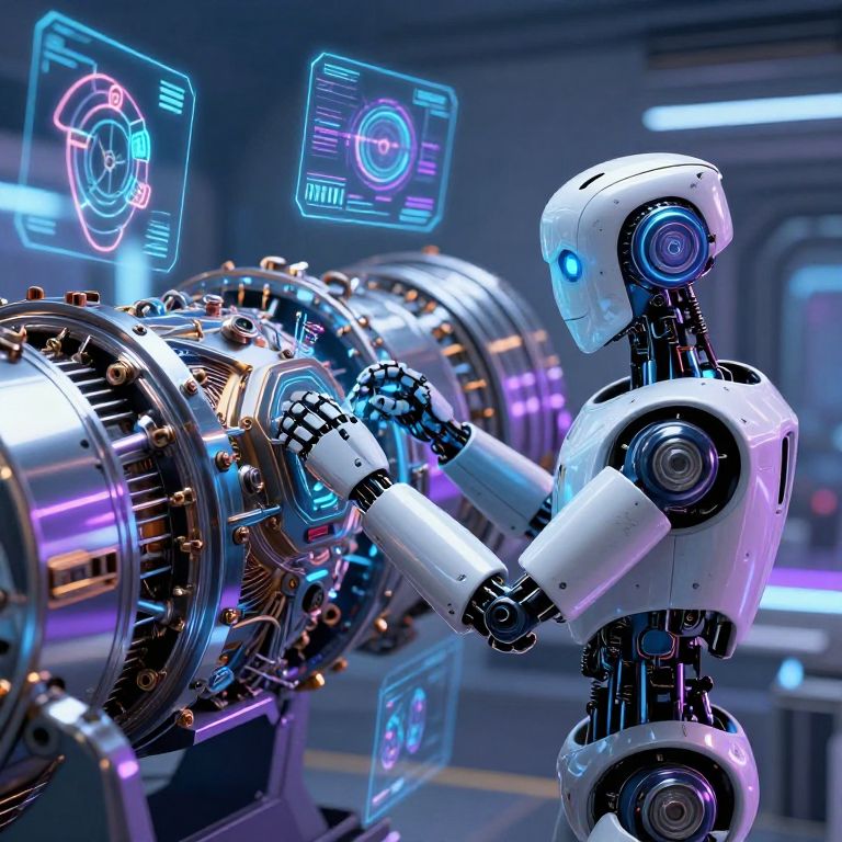 Photorealistic digital artwork depicting a white, humanoid robot with glowing blue eyes and black joints, working on two large, cylindrical, metallic engines with intricate gears and neon blue-purple accents. The background features a futuristic, dimly-lit industrial setting with neon-lit holographic displays showing technical diagrams. The robot's design is sleek and modern, with smooth, shiny surfaces and precise, mechanical joints. The holographic screens add a sci-fi element, enhancing the high-tech atmosphere. The scene emphasizes advanced technology and robotics, with a focus on precision and engineering.