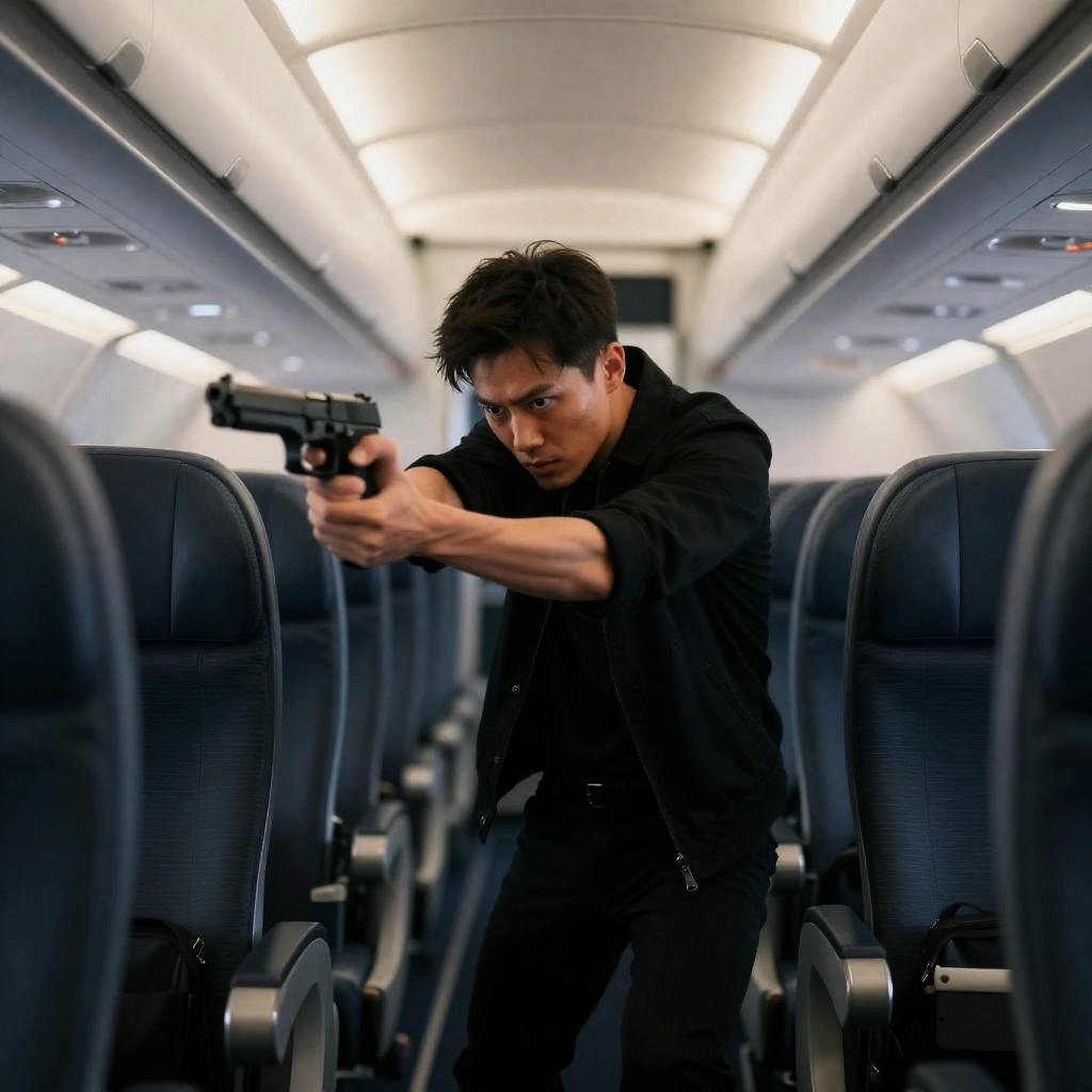 Man with dark hair, wearing black jacket, points handgun to the right, intense expression. Background: airplane interior, overhead bins, seats. He stands in the aisle, holding handgun with right hand, left arm slightly raised. Two overhead bins visible.
