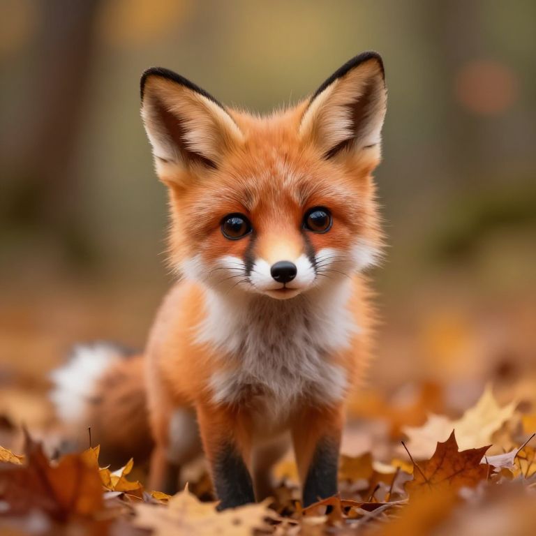 Photograph of an adorable, young red fox cub standing in an autumn forest. The cub has vibrant orange fur with white accents on its chest and face, and black-tipped ears. Its large, dark eyes are wide and expressive. The forest floor is covered in brown and orange fallen leaves. The background is softly blurred, highlighting the cub as the focal point. The lighting is natural, emphasizing the fox's fluffy fur and the warm autumn colors. The overall image conveys a sense of innocence and natural beauty.