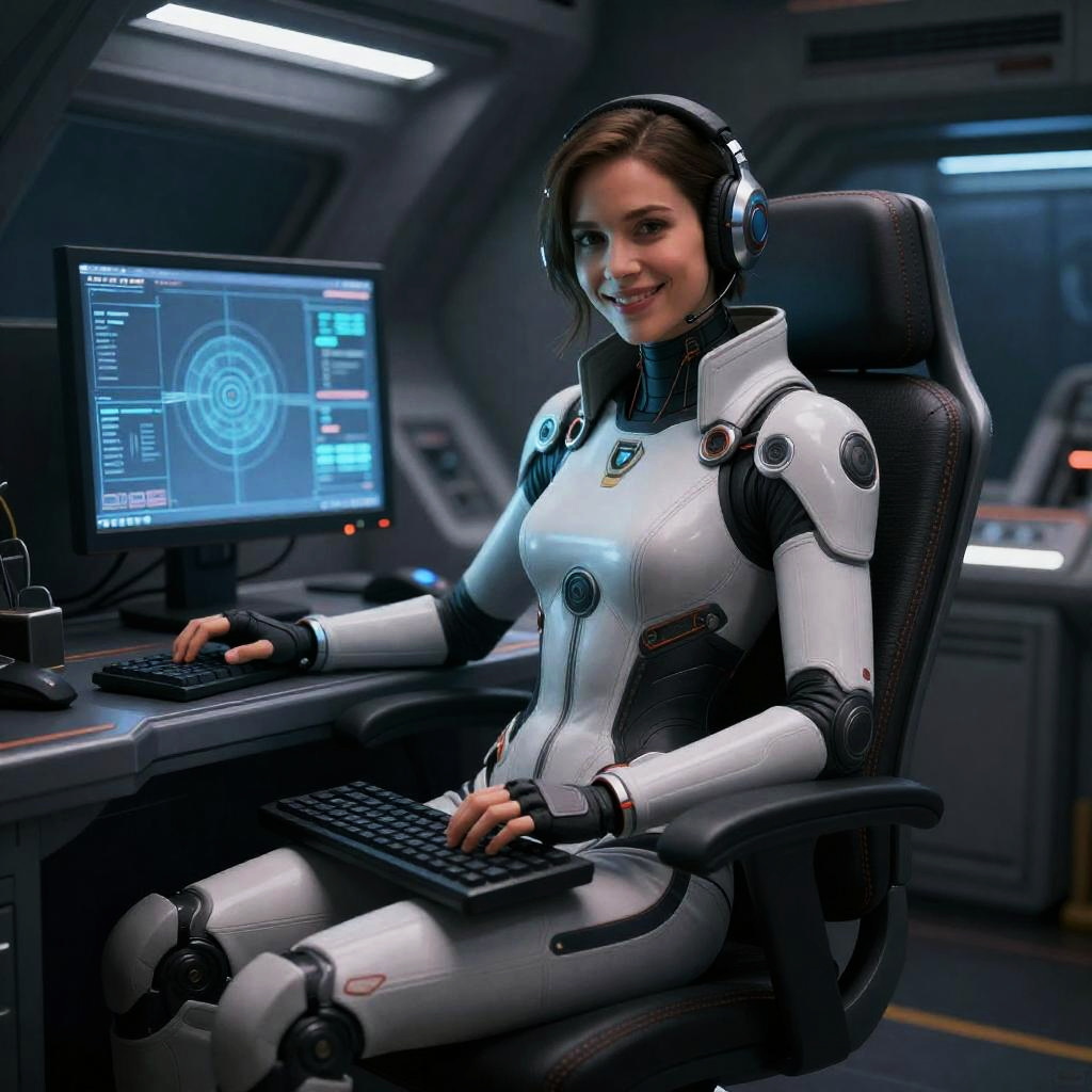 A woman sitting in a chair with a computer on it's back and a keyboard on her lap, Eve Ryder, laurie greasley, cyberpunk art, space art, mecha pilot girl, smile, 1girl, mecha, cockpit, inside robot slim body, body suit, high-tech theme, small hip, high detail, realistic, photo quality, high quality, (photorealistic:1.4), science fiction