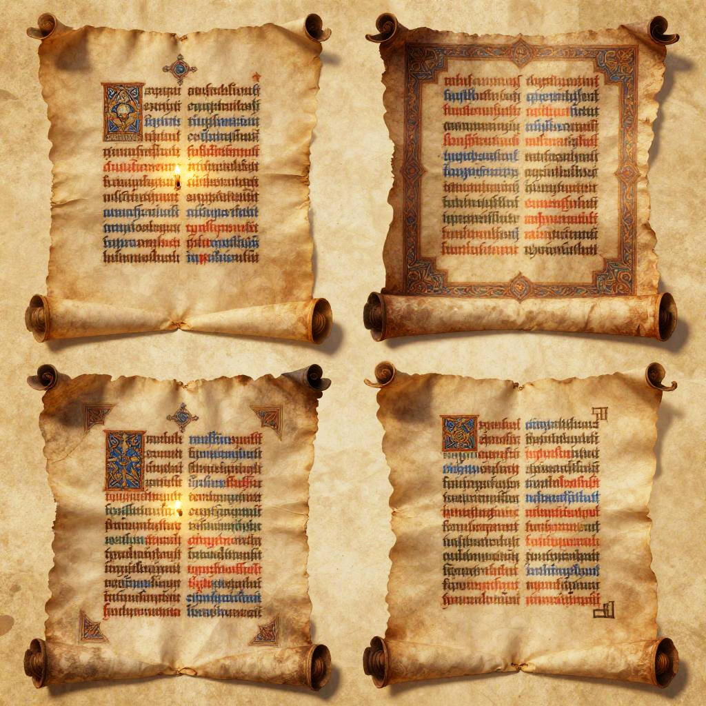 Titles displayed on vintage parchment scrolls, illuminated manuscript style with ornate borders, medieval calligraphy glowing softly under candlelight, warm tones and textured paper background, high-detail illustration