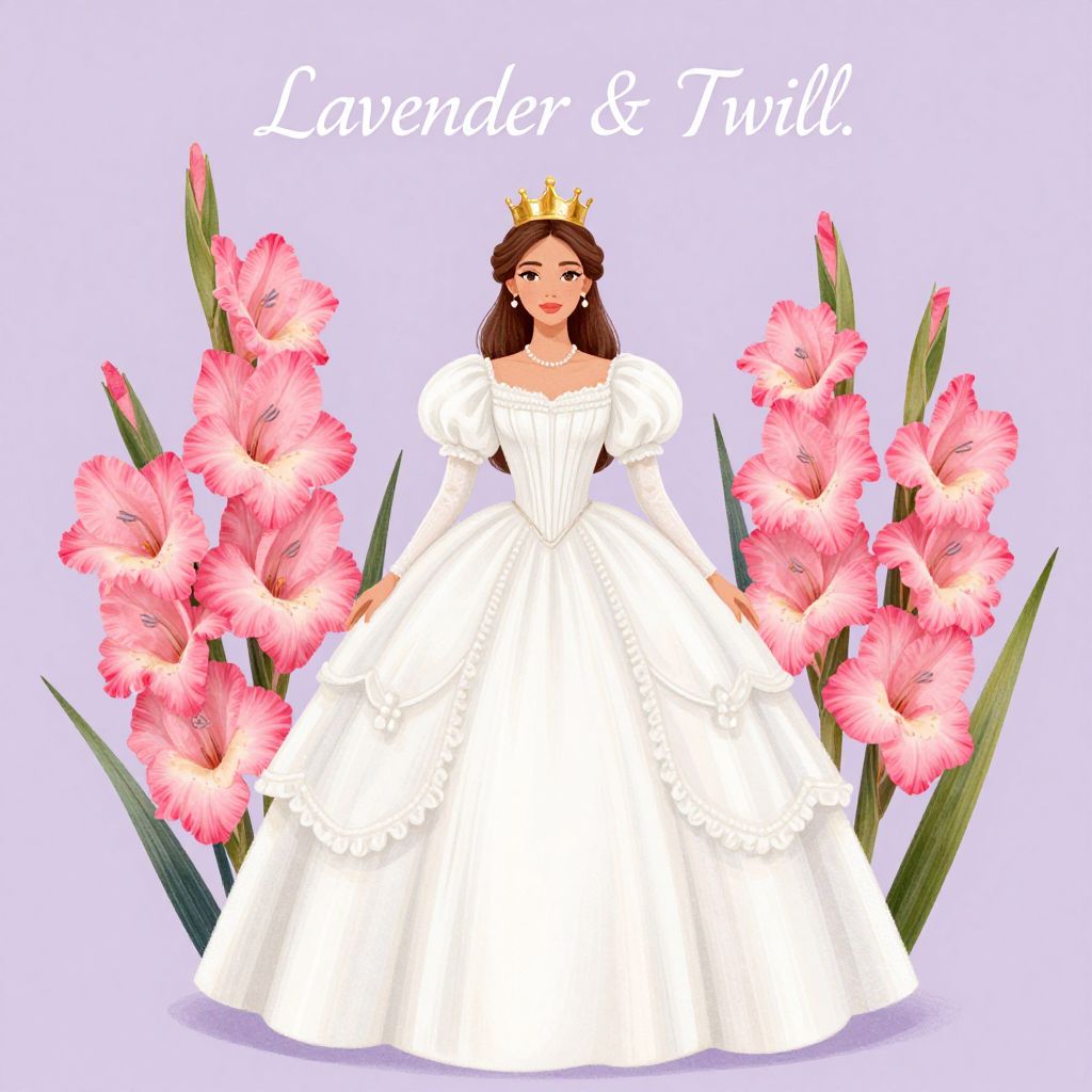 Elegant princess illustration featuring a woman in a vintage-inspired white gown with puffed sleeves and a golden crown, surrounded by vibrant pink gladiolus flowers against a soft lavender background, accompanied by the text \"Lavender & Twill.\