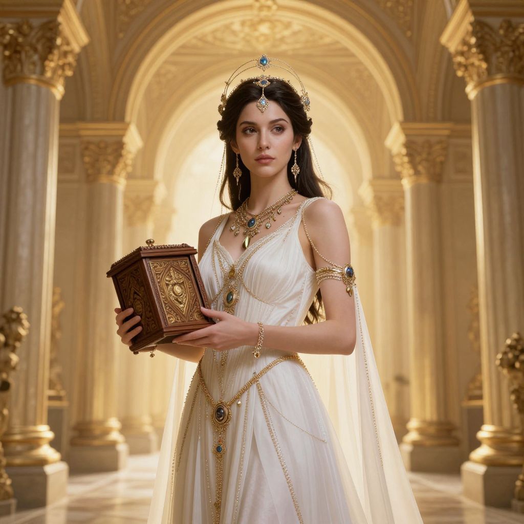 Digitally rendered portrait of a woman in a flowing white gown adorned with elaborate gold and gemstone jewelry. She holds a mysterious intricately designed wooden box. The background features grand classical columns and a golden-lit archway, creating a timeless and ethereal atmosphere.
