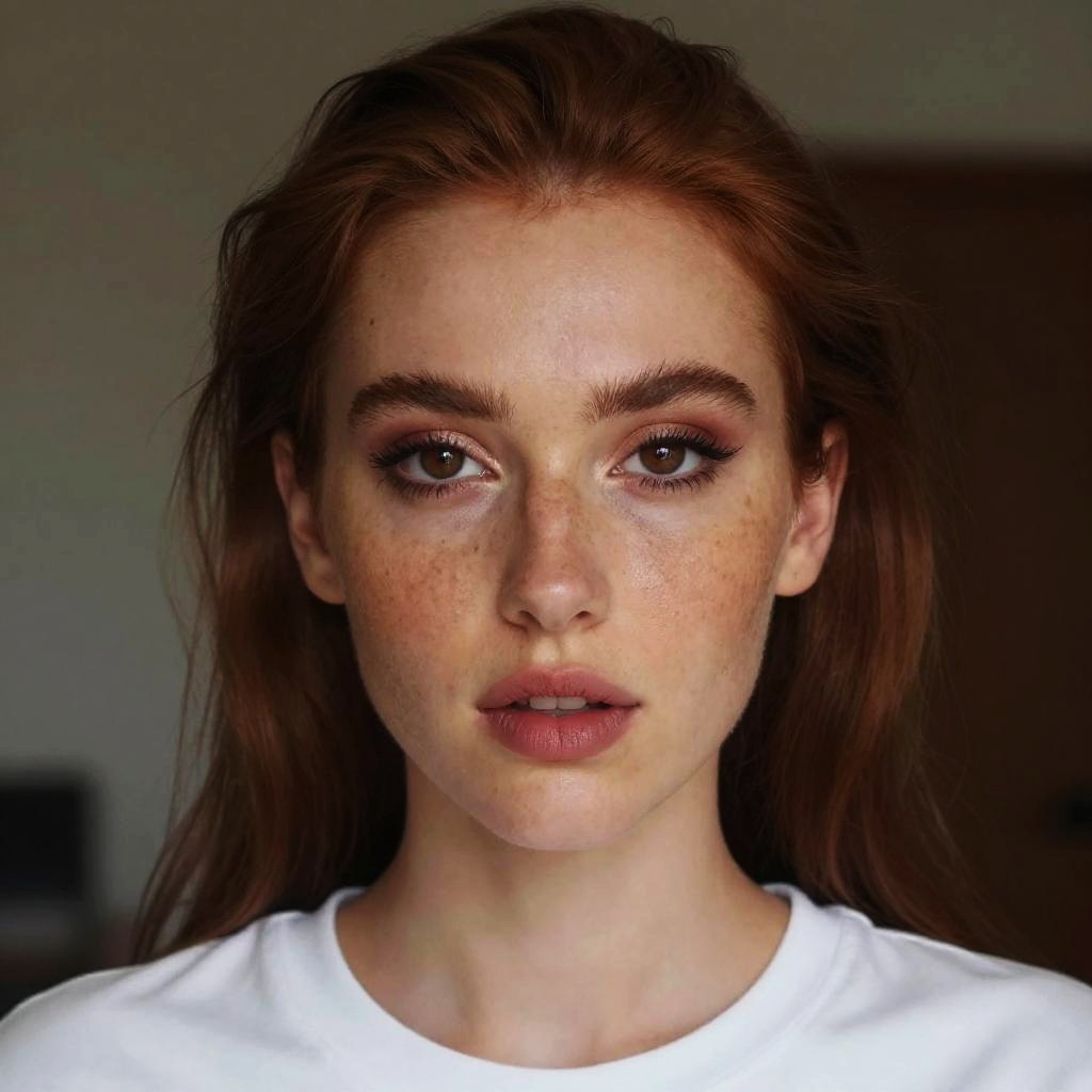 This is a high-resolution photograph of a young woman with fair skin and numerous freckles across her face. She has long, straight, auburn hair that is slightly tousled. Her large, almond-shaped brown eyes are accentuated with dark eyeliner and mascara, and she has full, slightly glossy pink lips. She is wearing a plain white t-shirt. The background is blurred, showing a dark brown door and a faintly lit, beige wall. The lighting is natural, highlighting her freckles and the texture of her skin. The overall style of the photograph is realistic and detailed.