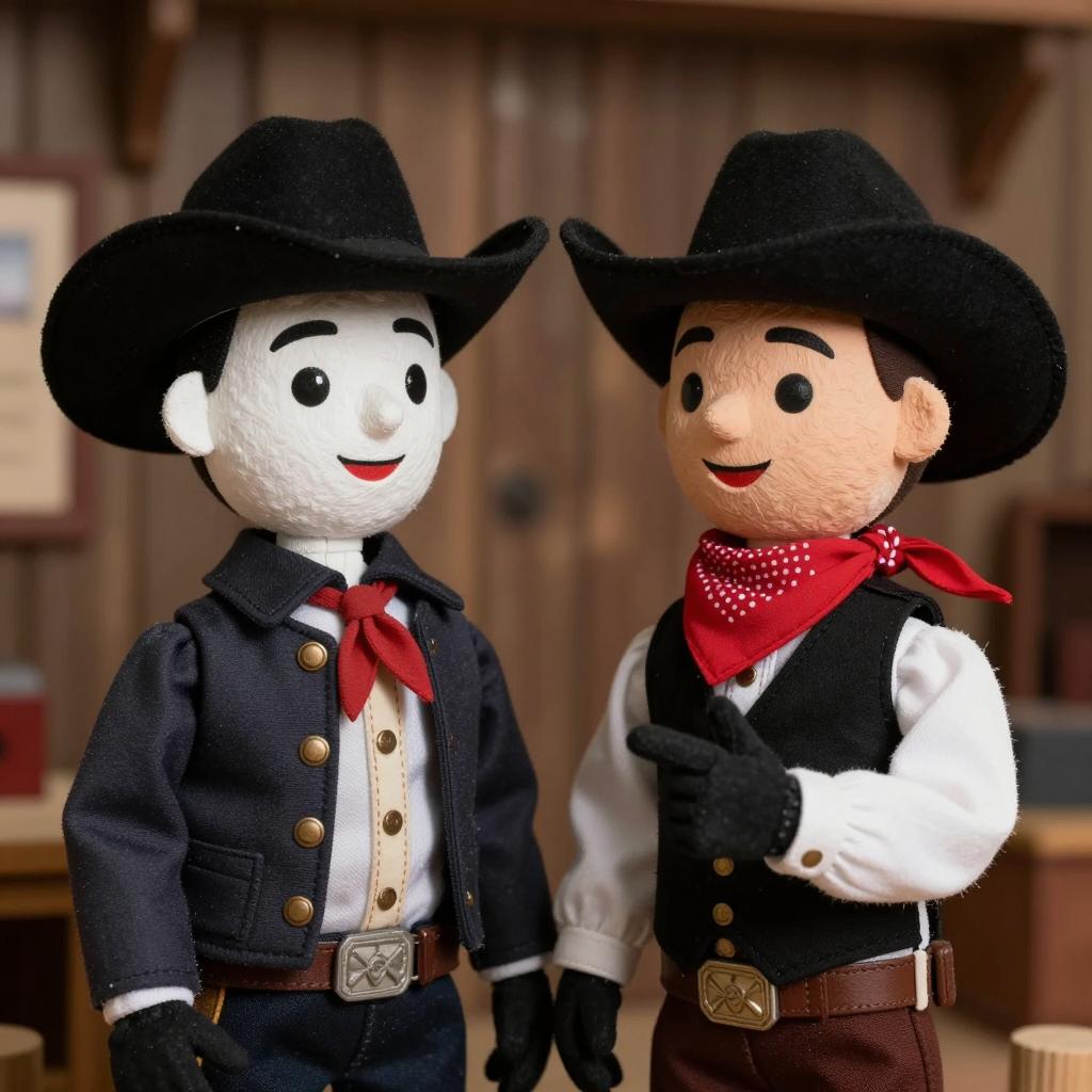Two puppet figures in Western attire. The left puppet has a white face, black cowboy hat, and dark clothing. The right puppet has a red bandana, black cowboy hat, white shirt, and black vest. Both have black gloves and are smiling. The right puppet is pointing. Background includes dimly lit wooden structures.