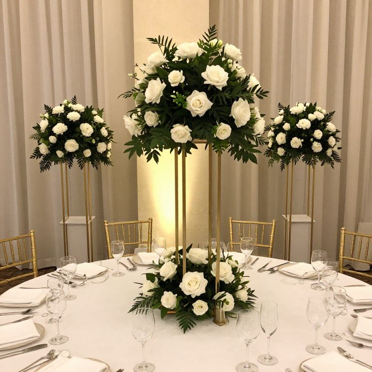 Photograph of a round table with a glass vase of peach and white roses, surrounded by clear glassware and white table settings in a softly lit,