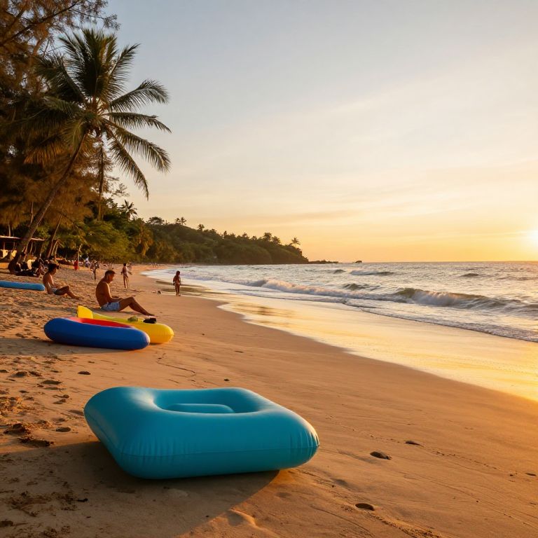 Sunset beach photograph: vibrant inflatable floats on golden sand, palm trees, people relaxing, calm waves, and a warm, orange-hued sky.