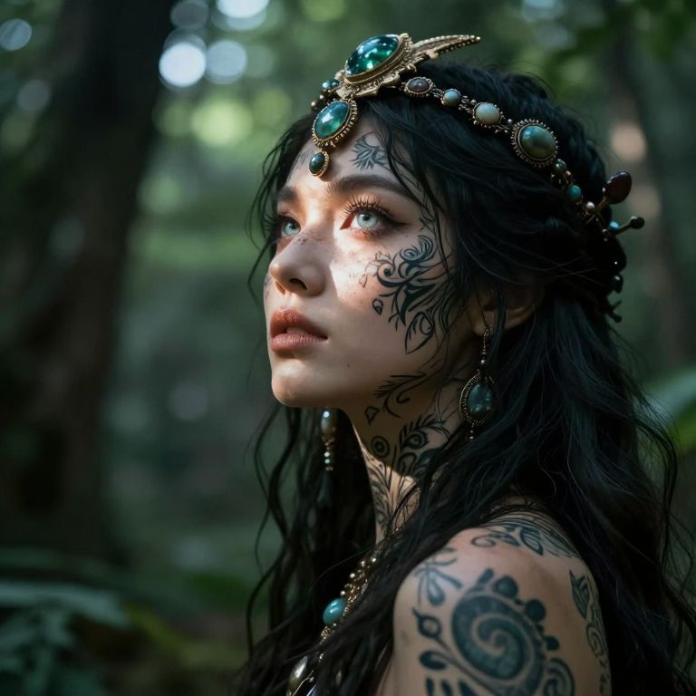 A captivating superrealistic portrait of an enigmatic sorceress stands at the mystical forest's edge. Her eyes, reflecting centuries of wisdom and secrets, gaze into a delicate interplay of light and shadow that creates an ethereal atmosphere. This illuminates her intricate facial tattoos and elaborate headdress adorned with semiprecious gems. As she turns her head slightly, captured from a unique low-angle perspective, the lush green foliage around her blurs into a dreamlike backdrop, evoking awe and enchantment that transcends time and space.