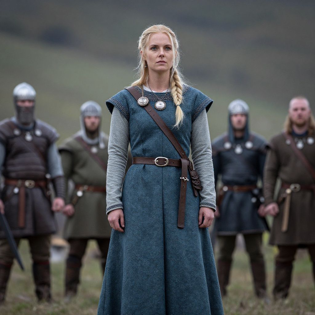 "Viking Warrior Costume Female, a woman in a medieval dress standing in front of a group of people"