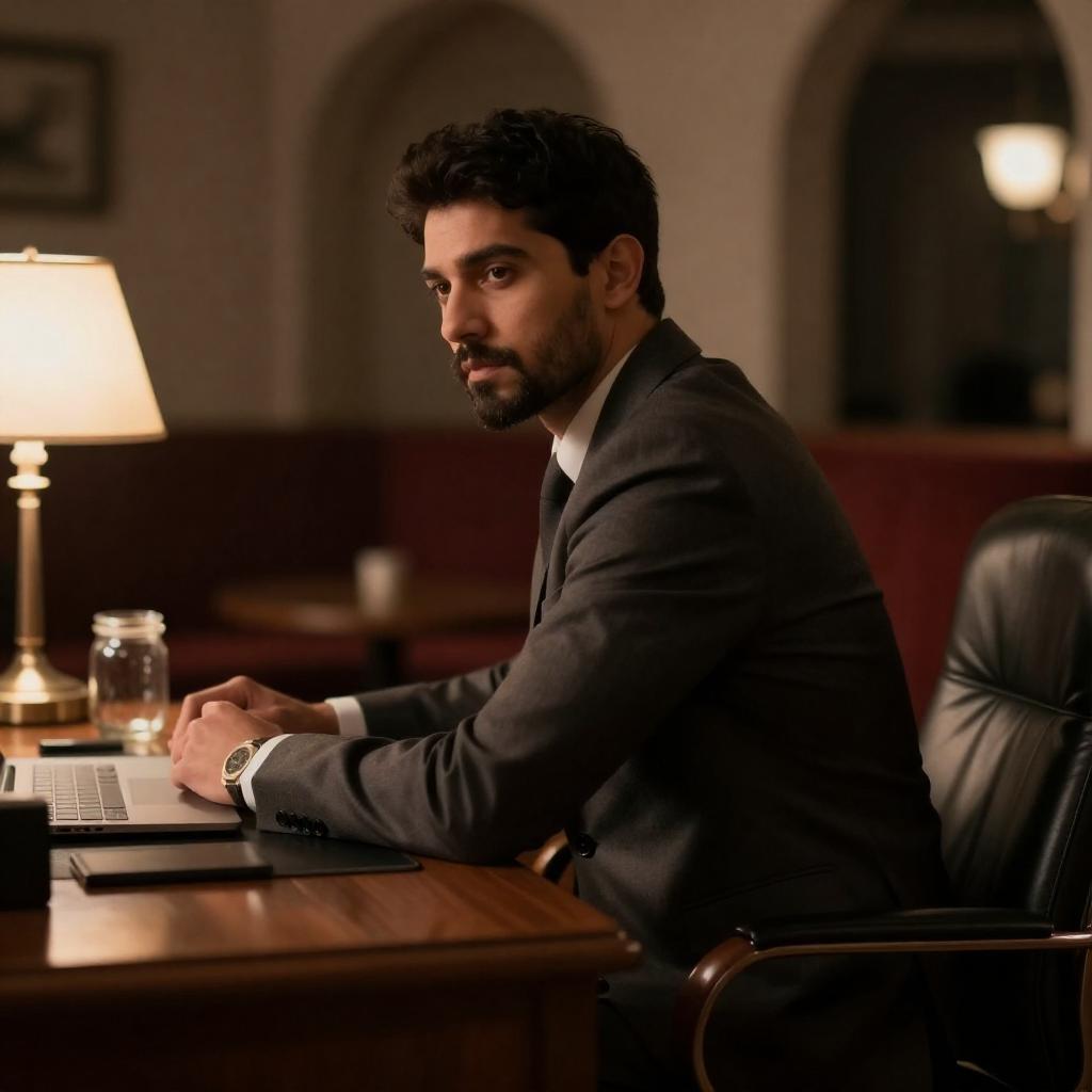 Photorealistic digital illustration of a bearded man with dark brown hair, wearing a brown suit and white shirt, holding a cigarette in his right hand. He stands in a suburban street with a yellow pedestrian sign, a white car, and a green building in the background. Power lines and a tree are also visible. The man's expression is neutral. Two other cars are parked on the street.
