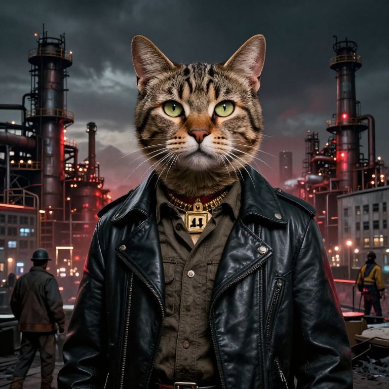 Digital art: Anthropomorphic tabby cat with green eyes, wearing black leather jacket and dark shirt, stands in dystopian industrial cityscape at night.