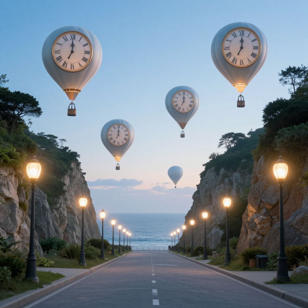 Photograph of a coastal road at twilight, flanked by rocky cliffs and illuminated by street lamps. Five large, white clock-shaped hot air balloons with black numbers and hands hover above the road, creating a whimsical scene. A smaller hot air balloon is visible in the distance. The sky transitions from blue to pink near the horizon, with the ocean visible at the road's end. Trees and shrubs are scattered along the cliffs, adding greenery to the rocky landscape. The road is empty, and the street lamps cast a warm, yellow glow.