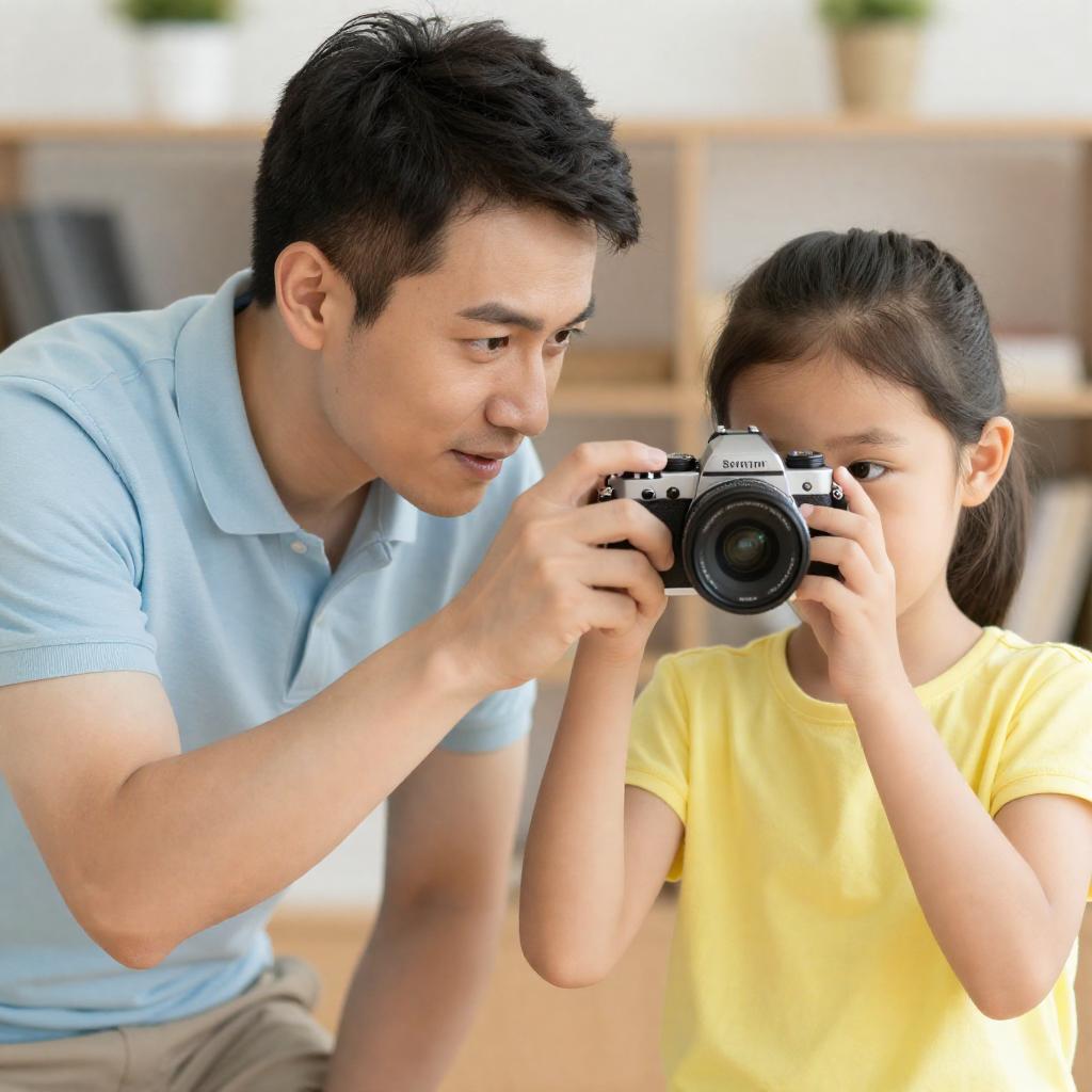 A photograph of a man and a young girl working together on a camera. The man, with short dark hair and wearing a light blue shirt, is positioned on the left, leaning slightly forward with a focused expression. The young girl, with dark hair tied back and wearing a yellow blouse, is on the right, also leaning forward and intently looking through the camera's viewfinder. The man's right hand is gently guiding the girl's left hand, which is holding the camera. The background is blurred, suggesting an indoor setting with warm lighting. The image has a vibrant, slightly saturated color palette