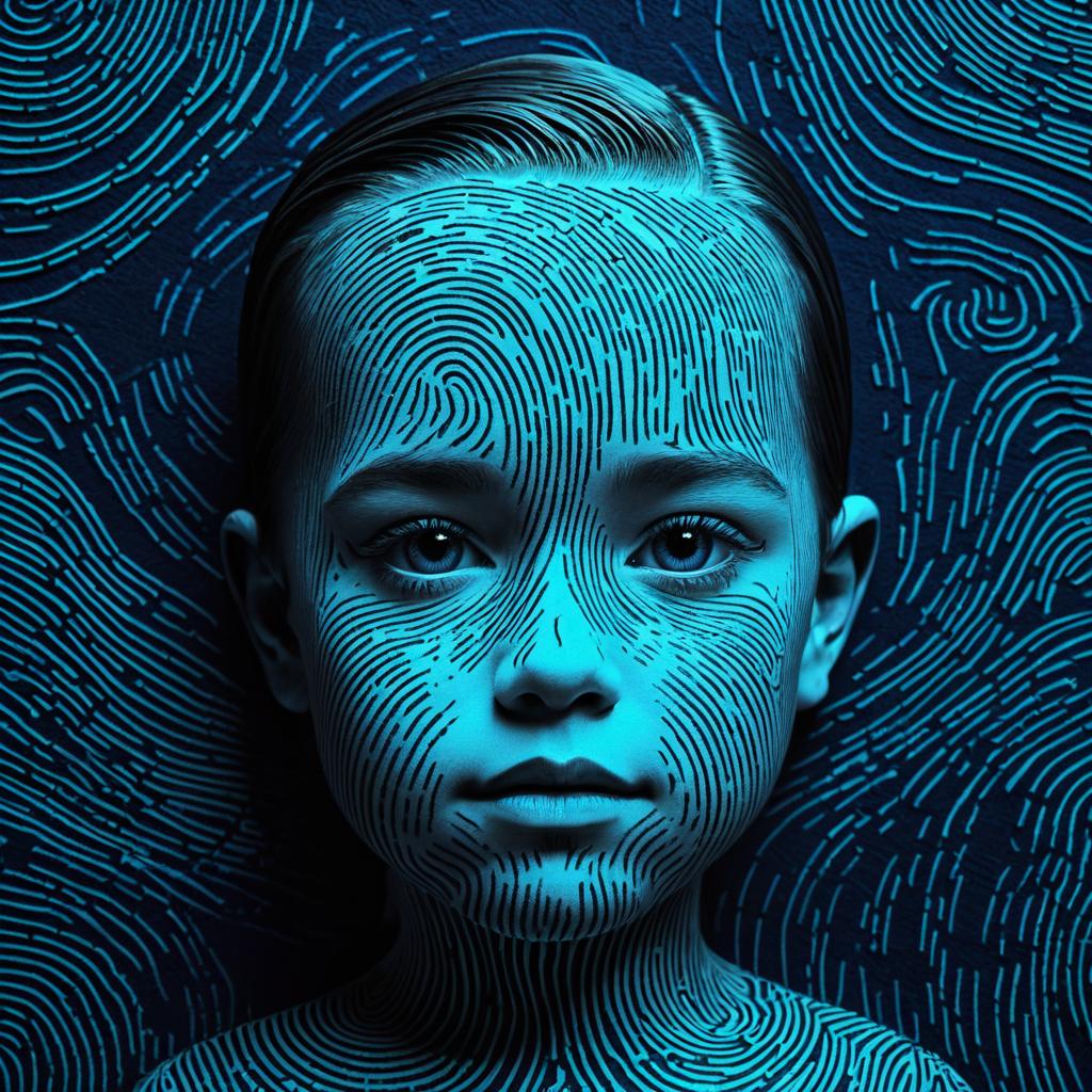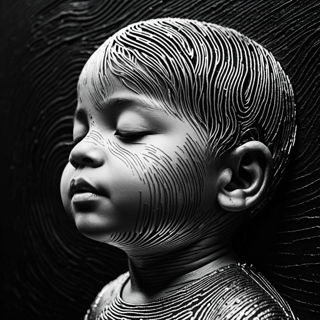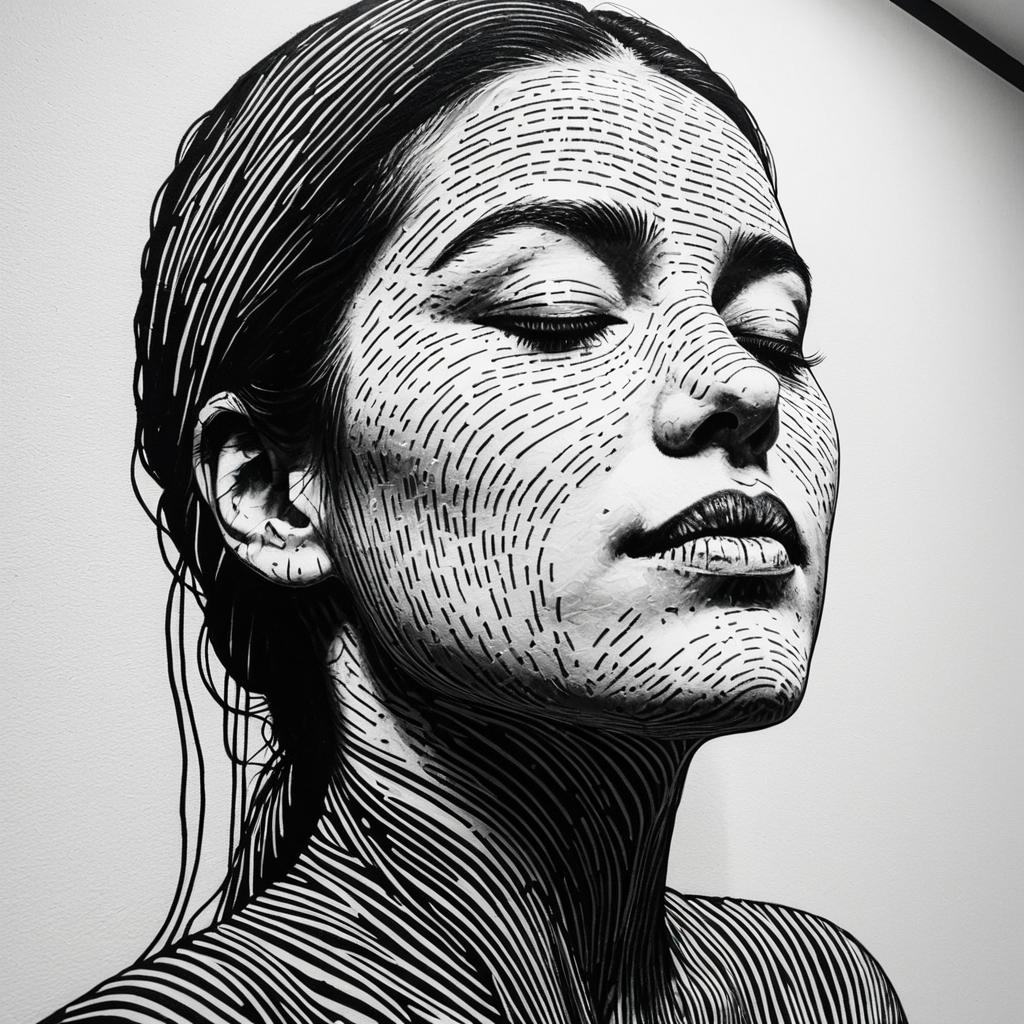 A fingerprint that forms a woman's face with closed eyes, each line is on different 3D depth height, hyperrealistic, black paint on a white wall, serene expression, intricate details, masterpiece, 4k, trending on ArtStation