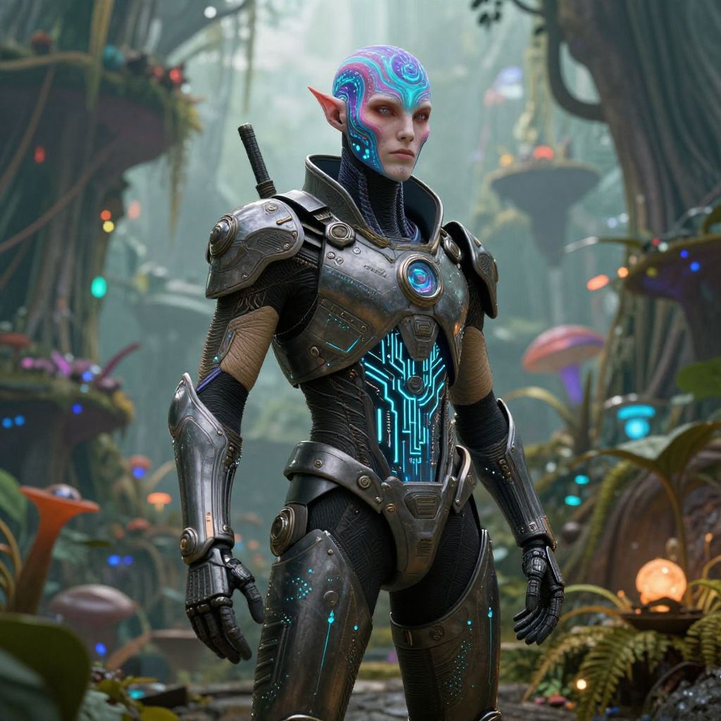 Digital art of a blue-skinned, elf-like female warrior with glowing cybernetic armor, standing in a vibrant, futuristic forest with glowing mushrooms and