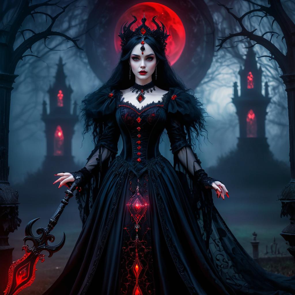 A gothic dark sorceress with piercing red eyes wearing an ornate black dress adorned with red gemstones stands in a misty graveyard under a full moon. Her elaborate black crown and flowing black gown contrast with the eerie blue moonlight and the red glow from nearby lanterns. The scene is rich in vibrant colors, featuring twisted, barren trees and a mysterious, haunted atmosphere.