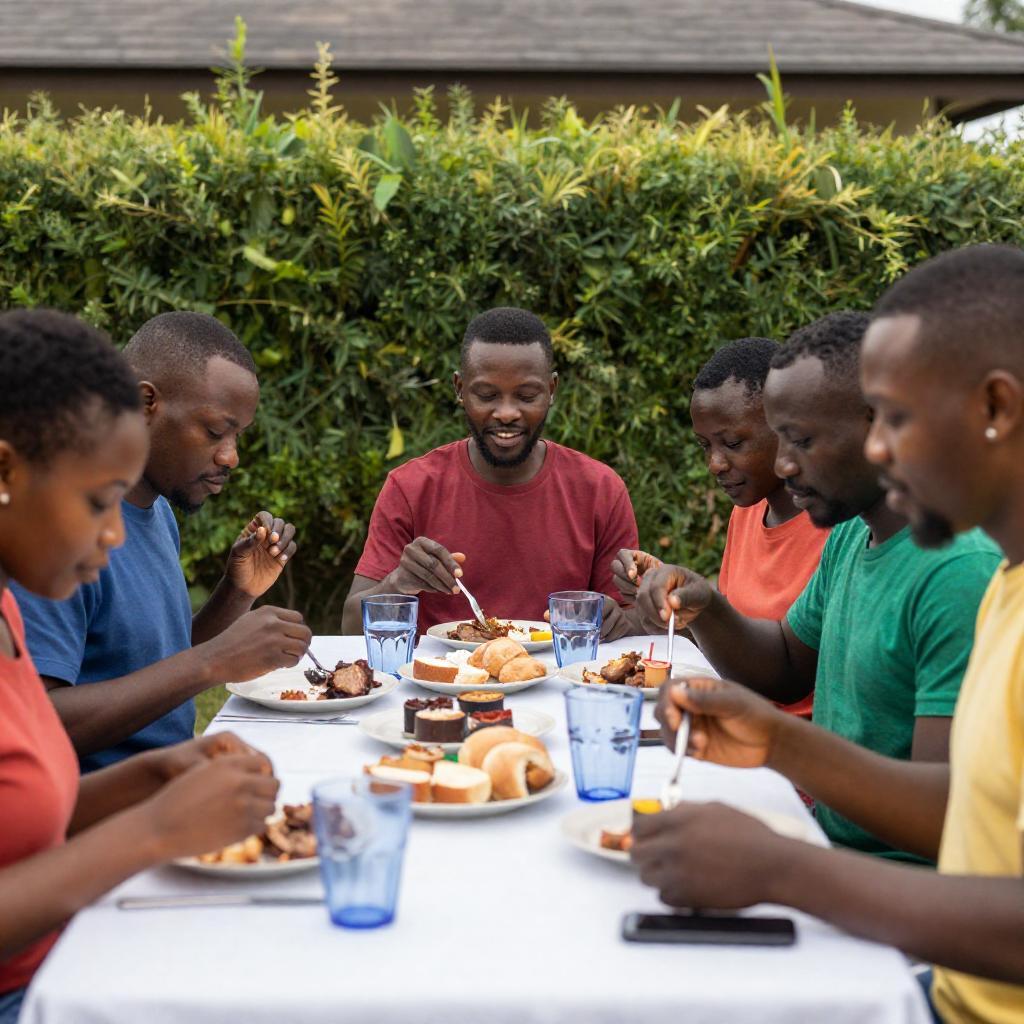 Photograph of six African American people sitting around a table eating. They wear casual, colorful shirts. Food includes meat, bread, and desserts. Glass pitcher in foreground, blue glasses, plates with food. Background: green hedge, house roof. Smiling, chatting, eating.