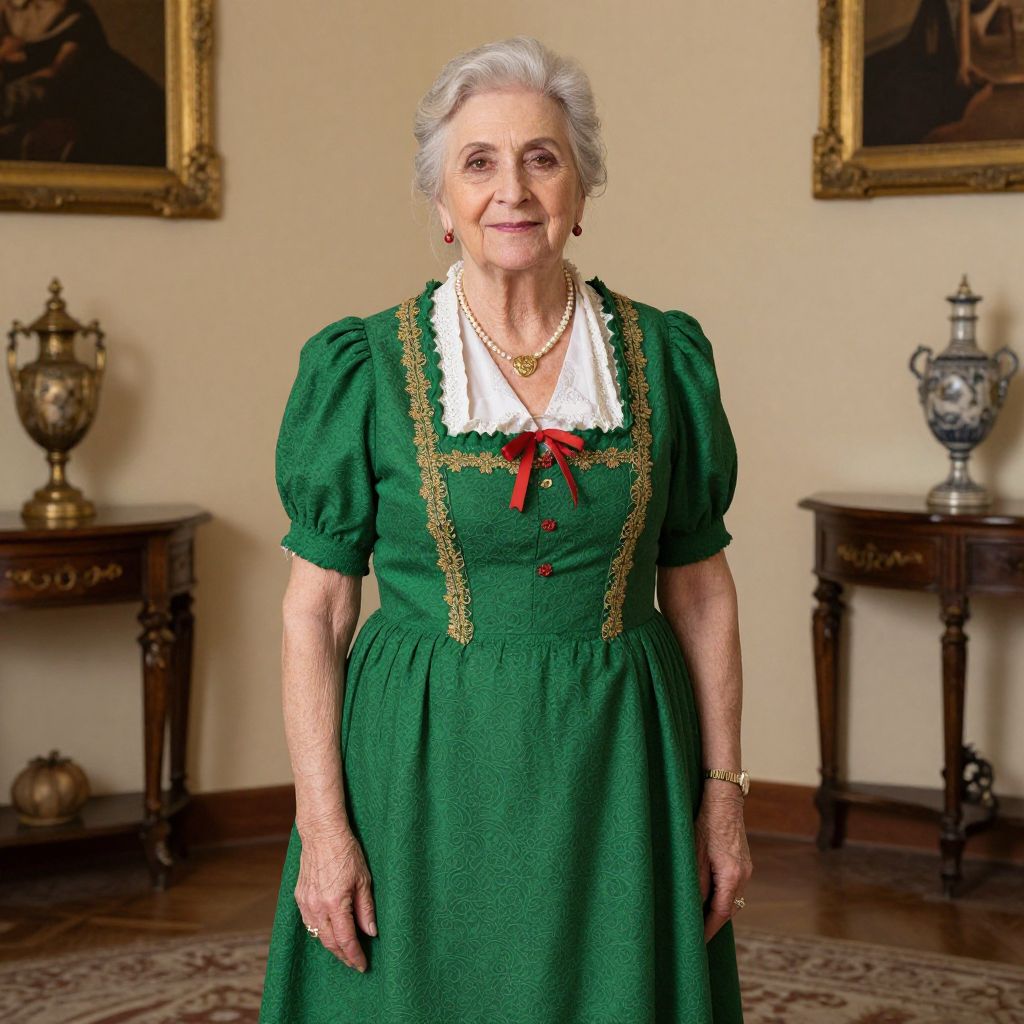 Photograph of an elderly white woman with short, white hair wearing a green, Victorian-style dress with puffed sleeves and a white, ruffled collar. The dress is adorned with gold trim and a red ribbon bow at the center. She wears a gold necklace and earrings. The background features a cream-colored wall with two framed paintings, a wooden table with an ornate urn on the left, and another table with a silver urn on the right. The floor is wooden, and there's a patterned rug in the foreground. The woman stands centered, smiling gently.