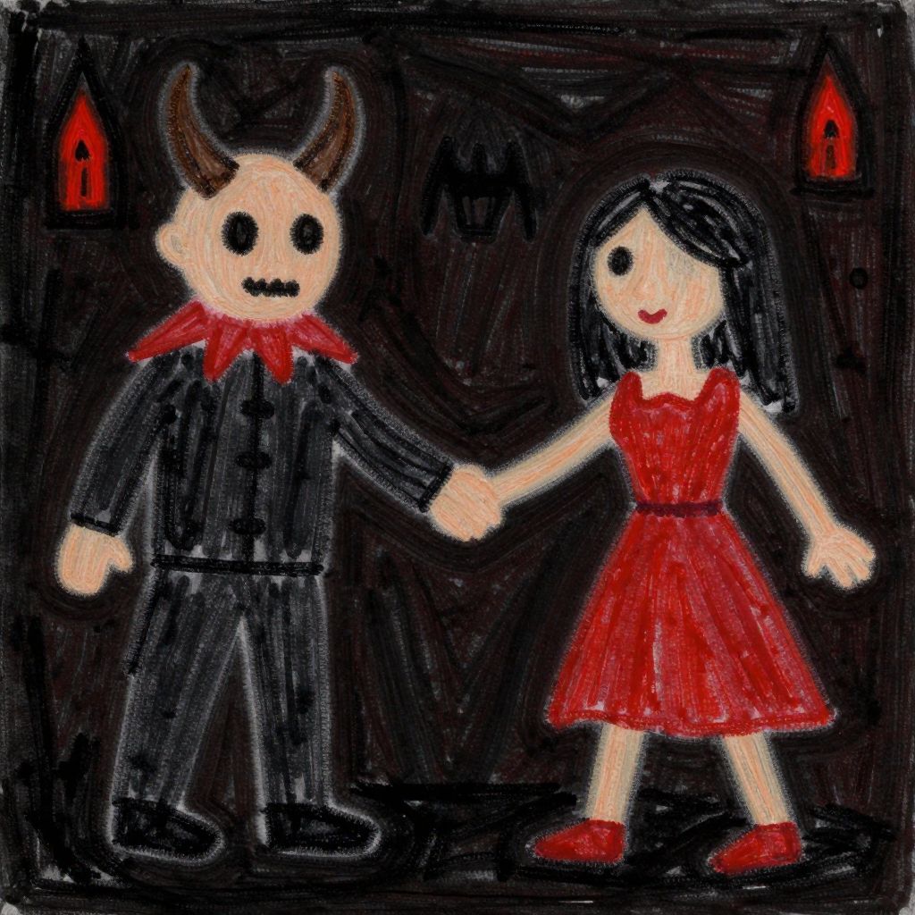 Two menacing figures with horns and a woman in a dress hold hands in a dark, horror-themed scene with red details, resembling a satanic ritual, rendered in a simple, children's drawing style.
