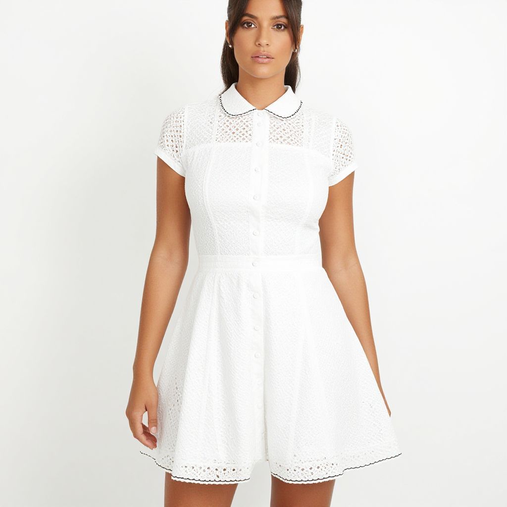 "Woman, vintage-inspired, eyelet lace dress in white, Peter Pan collar, short sleeves, fitted bodice with front button closure, flared skirt, mid-thigh length with scalloped hem, black trim detailing, simple stud earrings, white background.. Sexy. Pretty face and beаutiful eyes. Big breasts."