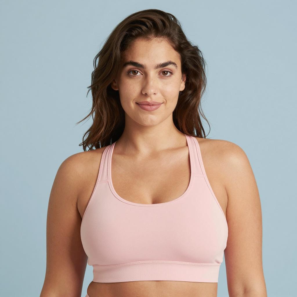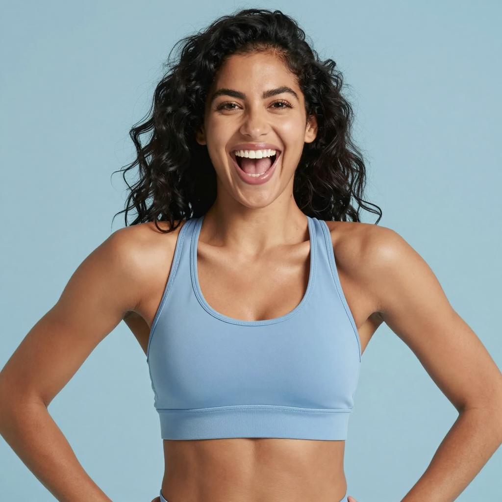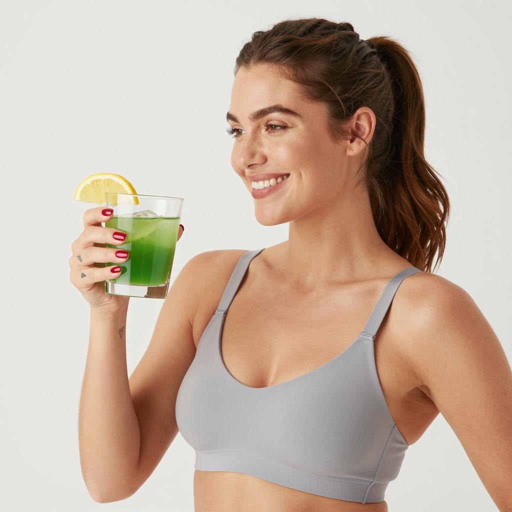 Woman with light skin, brown hair in a ponytail, wearing a grey bra, smiling, holding a clear glass with green liquid and lemon slice in her right hand. Red nails, small triangle tattoo on right hand, white background. Upper body shot.