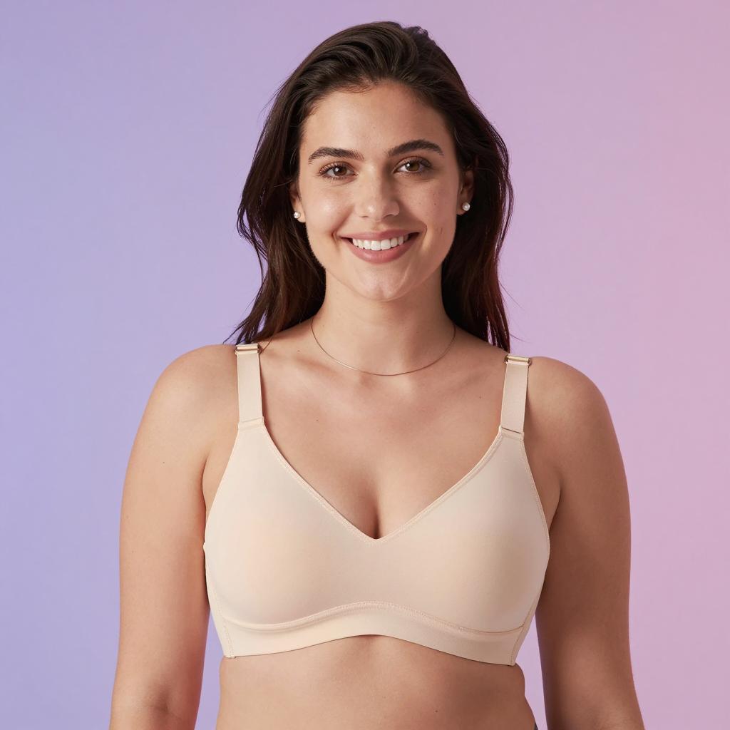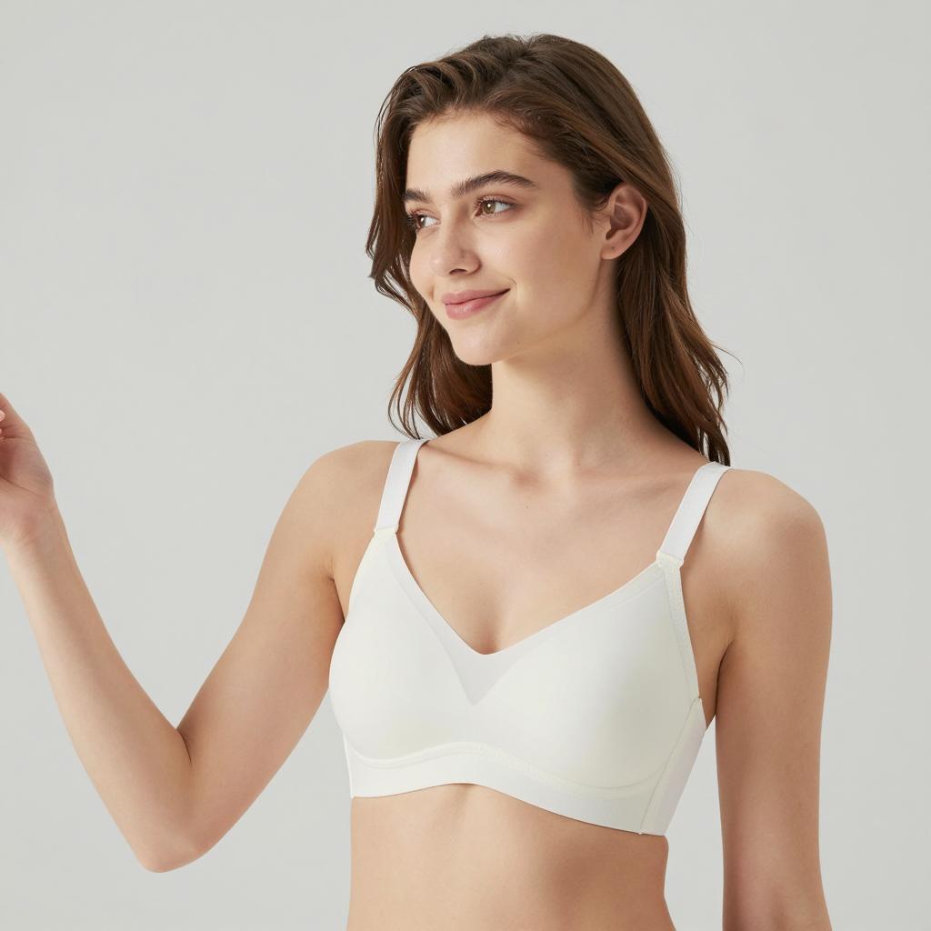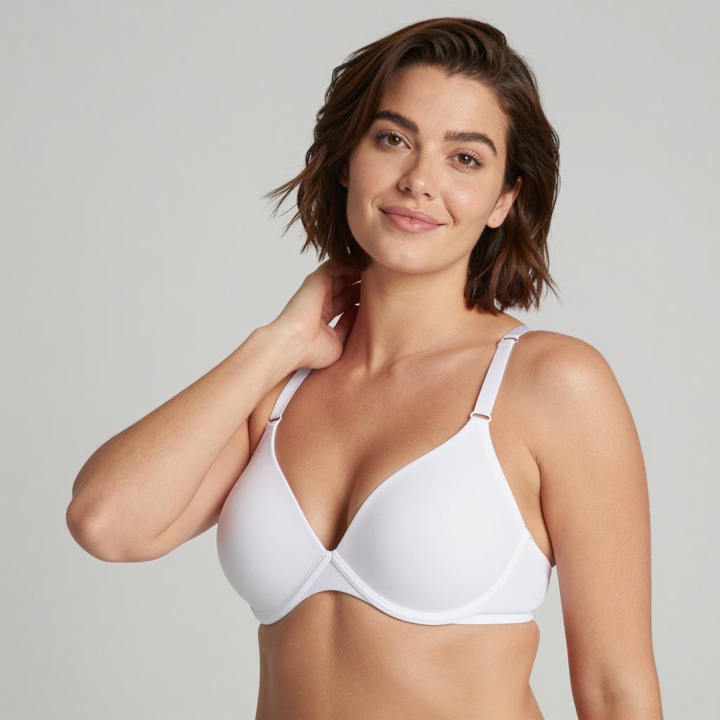 Woman with light skin, brown hair in a ponytail, wearing a grey bra, smiling, holding a clear glass with green liquid and lemon slice in her right hand. Red nails, small triangle tattoo on right hand, white background. Upper body shot.