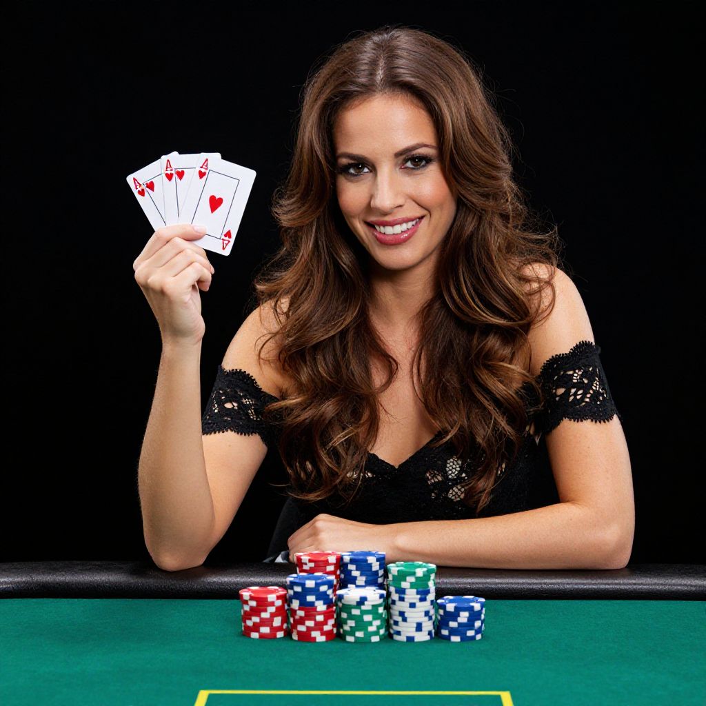 Photograph of a smiling woman with long, wavy brown hair wearing a black lace off-shoulder top. She's holding up a hand of three heart cards and resting her arm on a green poker table. In front of her are colorful poker chips (red, blue, green, white). The background is completely black, making her and the poker table the main focus.