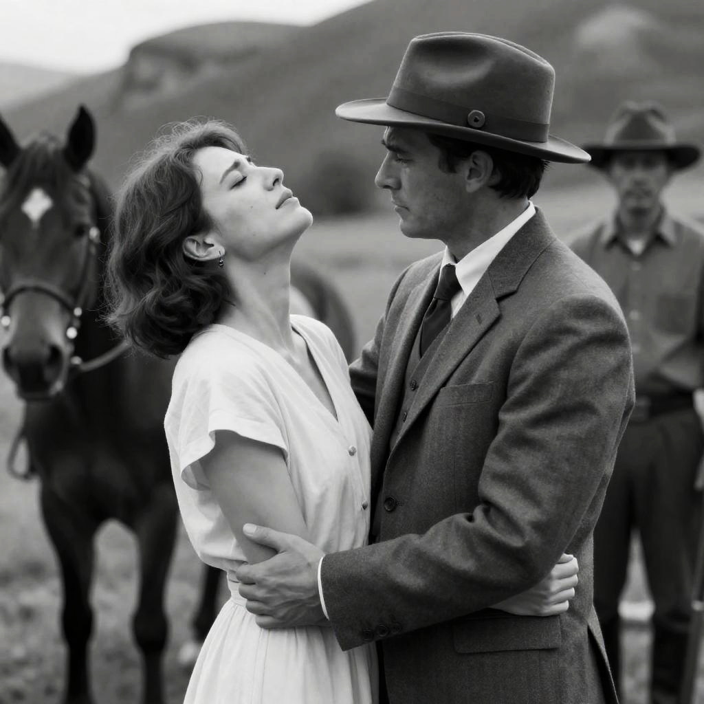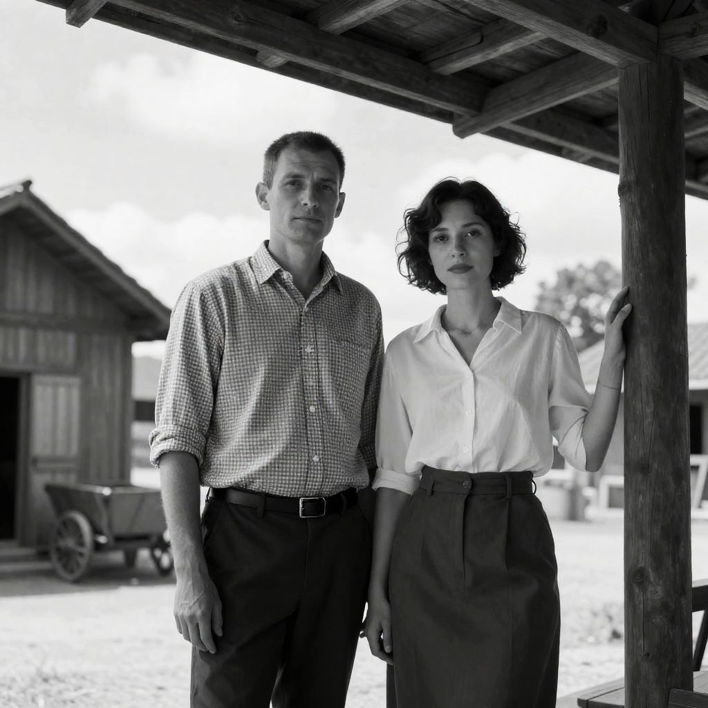 Black and white photograph featuring a man and a woman standing under a wooden roof. The man has short hair and is dressed in a checkered shirt and dark pants. The woman has short, curled hair and wears a button-up white blouse paired with a high-waisted dark skirt. She rests her hand on a sturdy wooden post. The background includes a rustic wooden building, a wagon, some trees, and a bright sky with scattered clouds. Both subjects have neutral facial expressions.