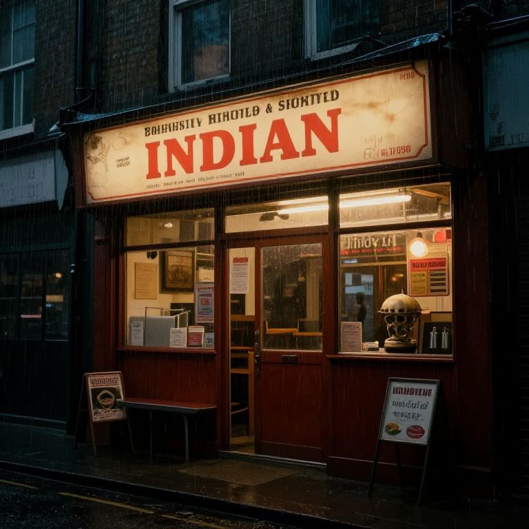 Retro Nostalgic Items Outside a run down Indian restaurant on a dimly lit backstreet in London in the rain, moody, atmospheric, dark, ultra high detail, photo realistic, movie poster,