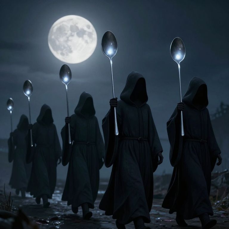 A hauntingly surreal 3D-rendered scene depicts an eerie procession of hooded figures marching under a luminous full moon, each holding elongated spoons whose silver heads gleam like celestial bodies, casting an otherworldly glow against the dark, atmospheric backdrop.