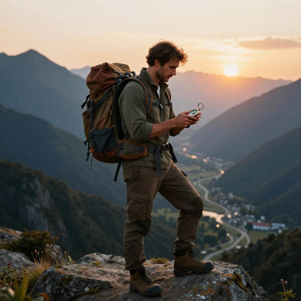 In a cozy lakeside boathouse, a rumpled clockwork fisherman sits at a small table, gazing at weathered nautical charts displayed on a chalkboard. Through the large window behind, a misty mountain range reflected on water adds to the tranquil atmosphere.