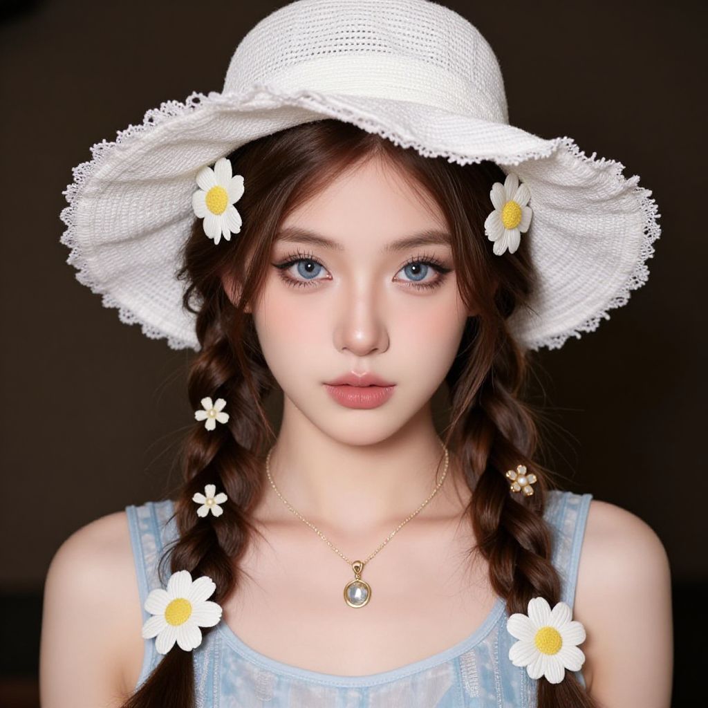 Photograph of a young woman with fair skin and striking blue eyes, wearing a brown cowboy hat, braided brown hair, and an off-shoulder denim dress with brown leather straps. She accessorizes with a silver necklace featuring a heart-shaped pendant and small hoop earrings. Her makeup is subtle, accentuating her natural beauty. The background is a plain, light-colored wall, and she gazes directly at the camera with a neutral expression. The image has a soft, natural light, highlighting her features and the textures of her clothing and hat.