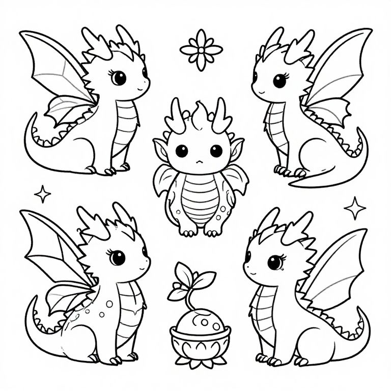 Coloring stencil of whimsical fantasy creatures including dragons and fairies, outlined in clear, bold lines with fantasy-themed decorative elements, ready for imaginative coloring activities.
