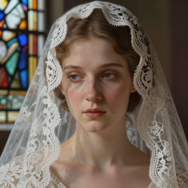 Lady Maria face framed by intricate lace veil, soft melancholic expression, pale luminous skin, subtle shadows accentuating cheekbones, gentle morning light filtering through stained glass, highly detailed digital painting with rich colors