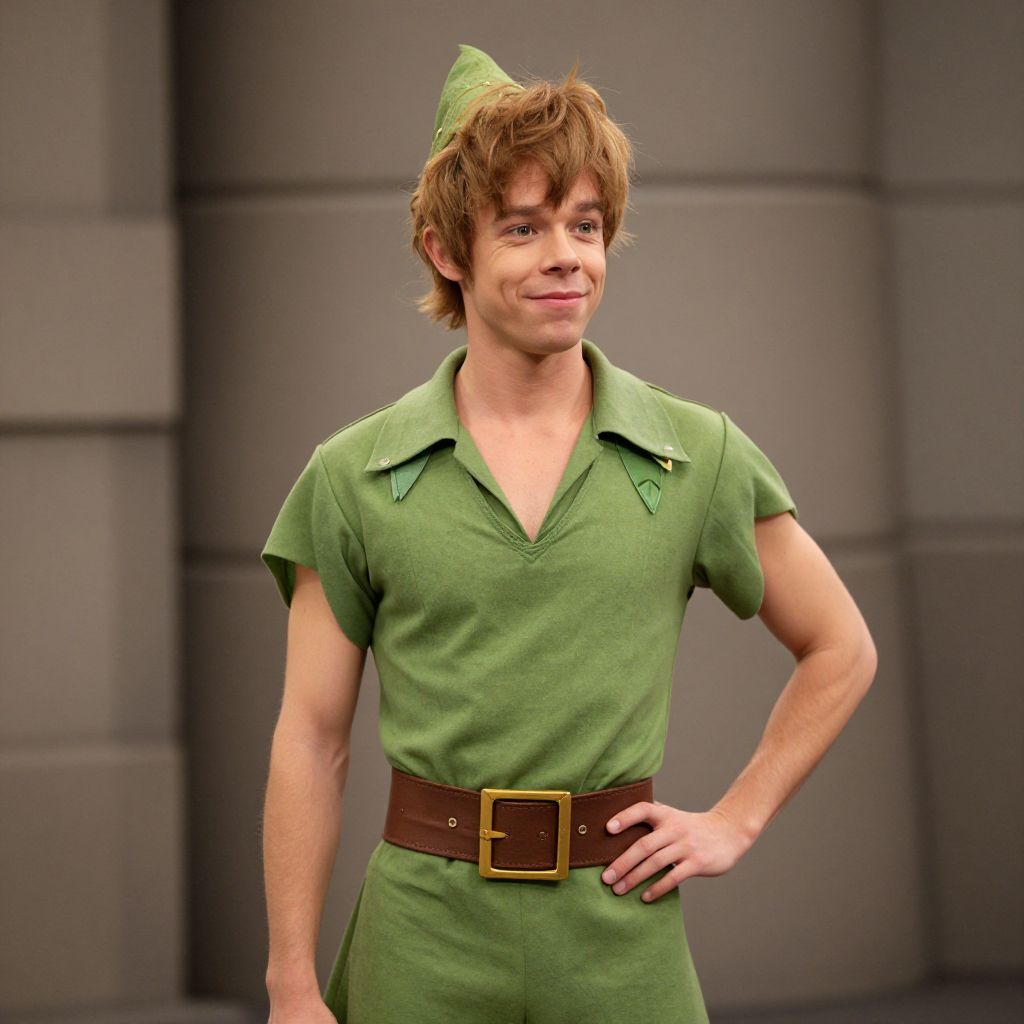Photograph of a young Caucasian man with light brown, slightly messy hair, wearing a green tunic and hat reminiscent of a fairy tale character, such as Robin Hood or Peter Pan. The tunic has short sleeves, a V-neck, and a brown belt with a large square buckle. He has a slender build, visible arm muscles, and a confident smile. The background is a simple, gray, tiled wall with a subtle shadow pattern. The lighting is even, highlighting his face and attire. The image has a slightly CGI-enhanced, polished look.