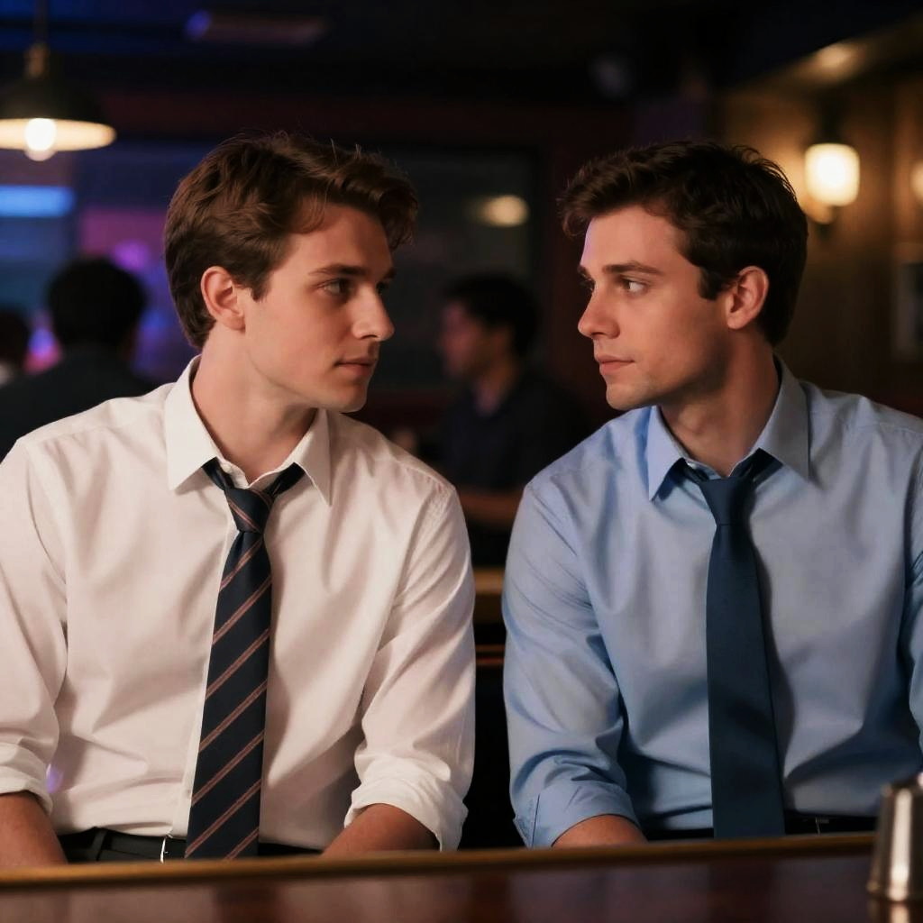 Photograph of two men lying close in bed. Both have messy brown hair, side profiles, and intense eye contact. One wears a blue shirt, the other is shirtless. Dark blue pillow behind them. Soft, dim lighting. Close-up shot.