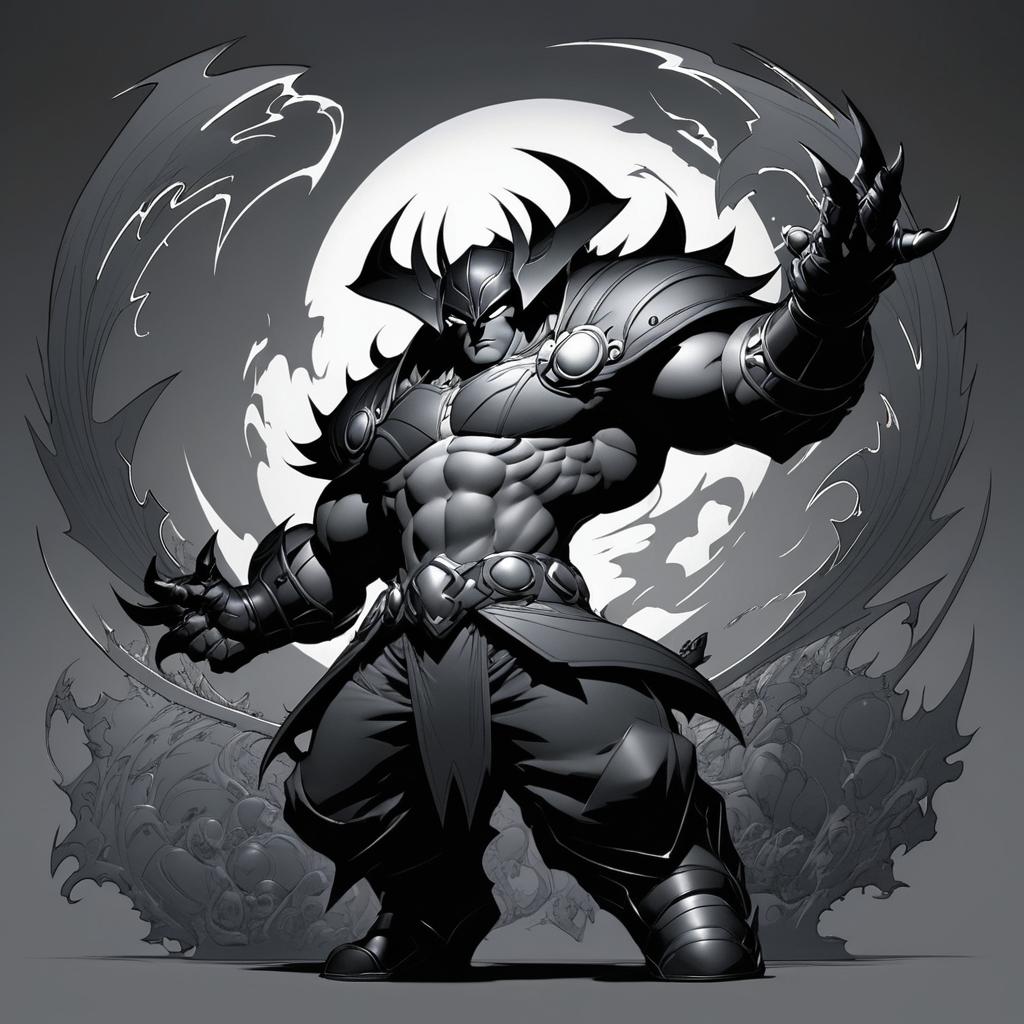 Digital illustration of a shadowy phantasm warrior in the style of Joe Madureira. The character is highly muscular, wearing dark, tattered armor with horn-like protrusions on the head and shoulders. The image is rendered in muted gray and black tones, highlighting sharp, bold lines and dynamic shading, creating a dramatic and intense atmosphere.