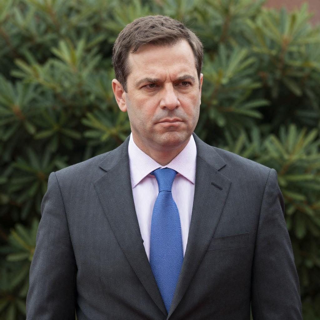 Photograph of a middle-aged man with short, dark brown hair, wearing a black double-breasted coat over a light blue shirt. He has a serious expression, slightly furrowed brows, and is slightly turned to the right. The blurred background shows a stone wall. The lighting is natural, highlighting his facial features.
