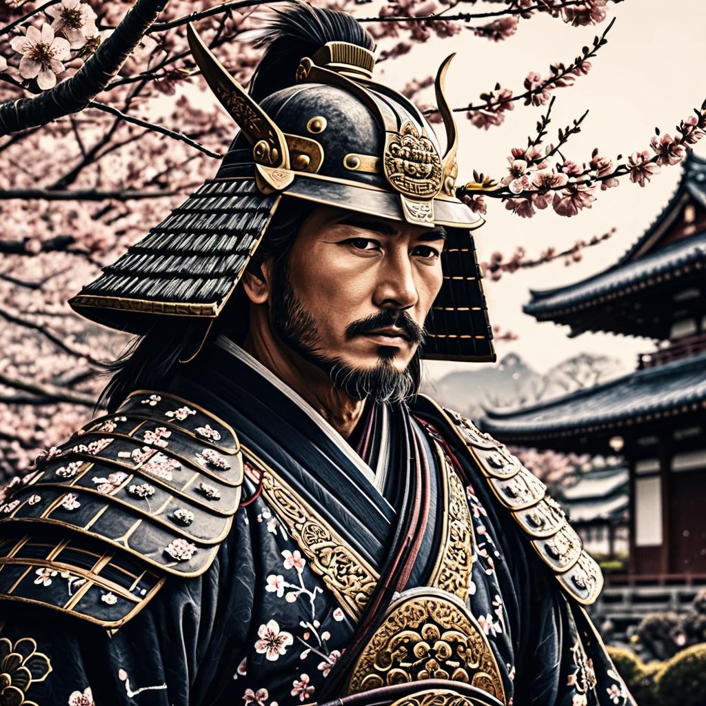 Closeup portrait of mighty ancient samurai wearing an ornate outfit, posed in cherry blossom garden at dawn, rendered in traditional Japanese ink painting, ultra-detailed textures, dramatic lighting, trending on ArtStation.
