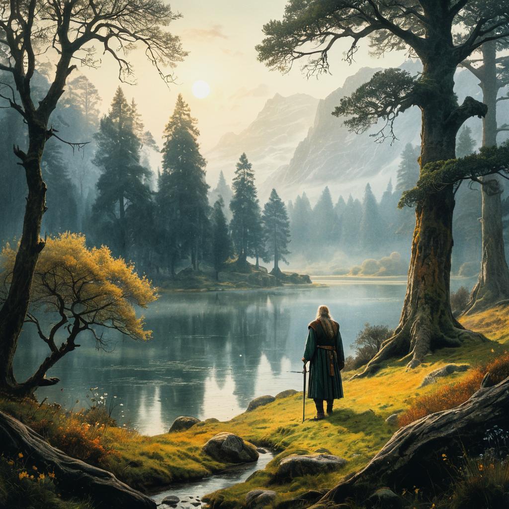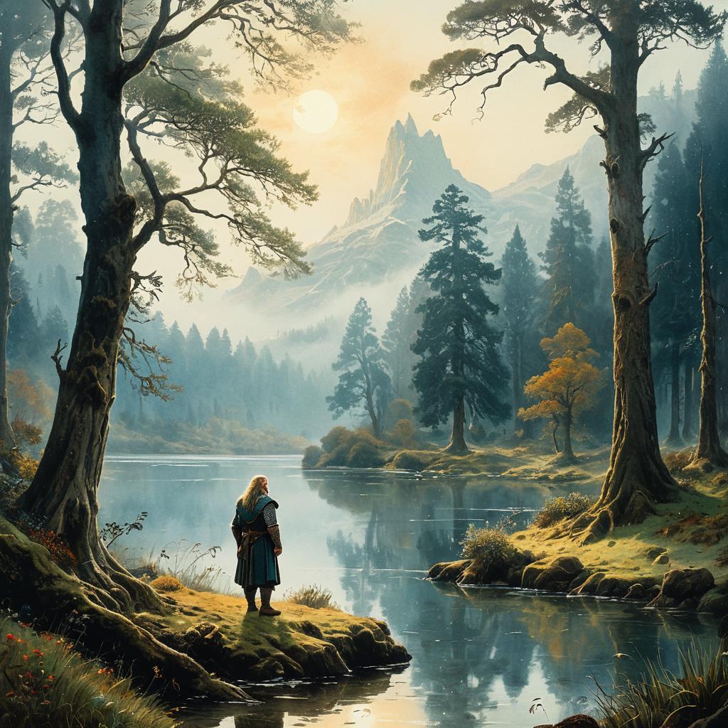 Théoden as a Watercolor Théoden stands in a misty glade, surrounded by ancient trees and a serene lake. The watercolor style is delicate and ethereal, with soft, flowing colors that suggest the magic and mystery of the Middle-earth saga. The artist who created this masterpiece is Albert Bierstadt, known for his dreamy, atmospheric landscapes. The color temperature is neutral, creating a sense of calm and tranquility that allows the viewer to appreciate the beauty of the natural world. Théoden's expression is serene, looking steadfastly ahead, perhaps contemplating the challenges that lie ahead. The lighting is soft and diffused, casting a gentle glow over the scene, creating a sense of peace and harmony.