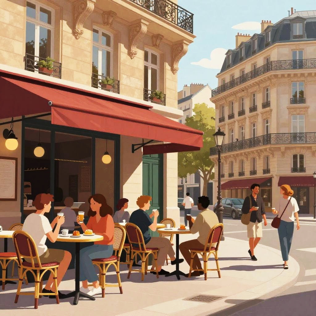 Francesa cafe scene in Paris, charming street with outdoor tables, warm sunlight casting soft shadows, people enjoying coffee and pastries, intricate architectural details on historic buildings, vibrant colors and lively atmosphere, vintage style illustration.