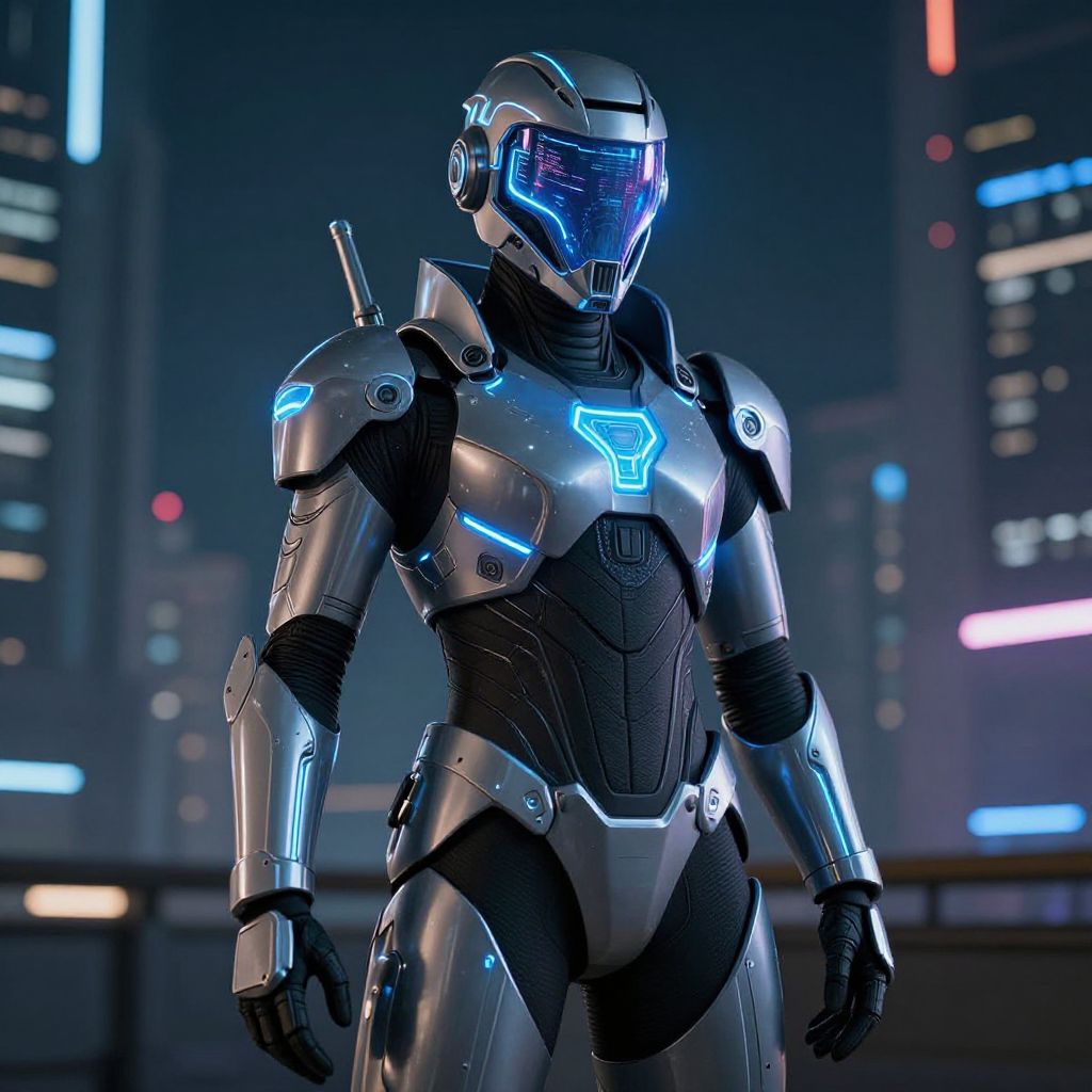 CGI image of a muscular, bald, robotic humanoid with glowing blue chest and limb accents, striking a powerful pose in a futuristic cityscape at night