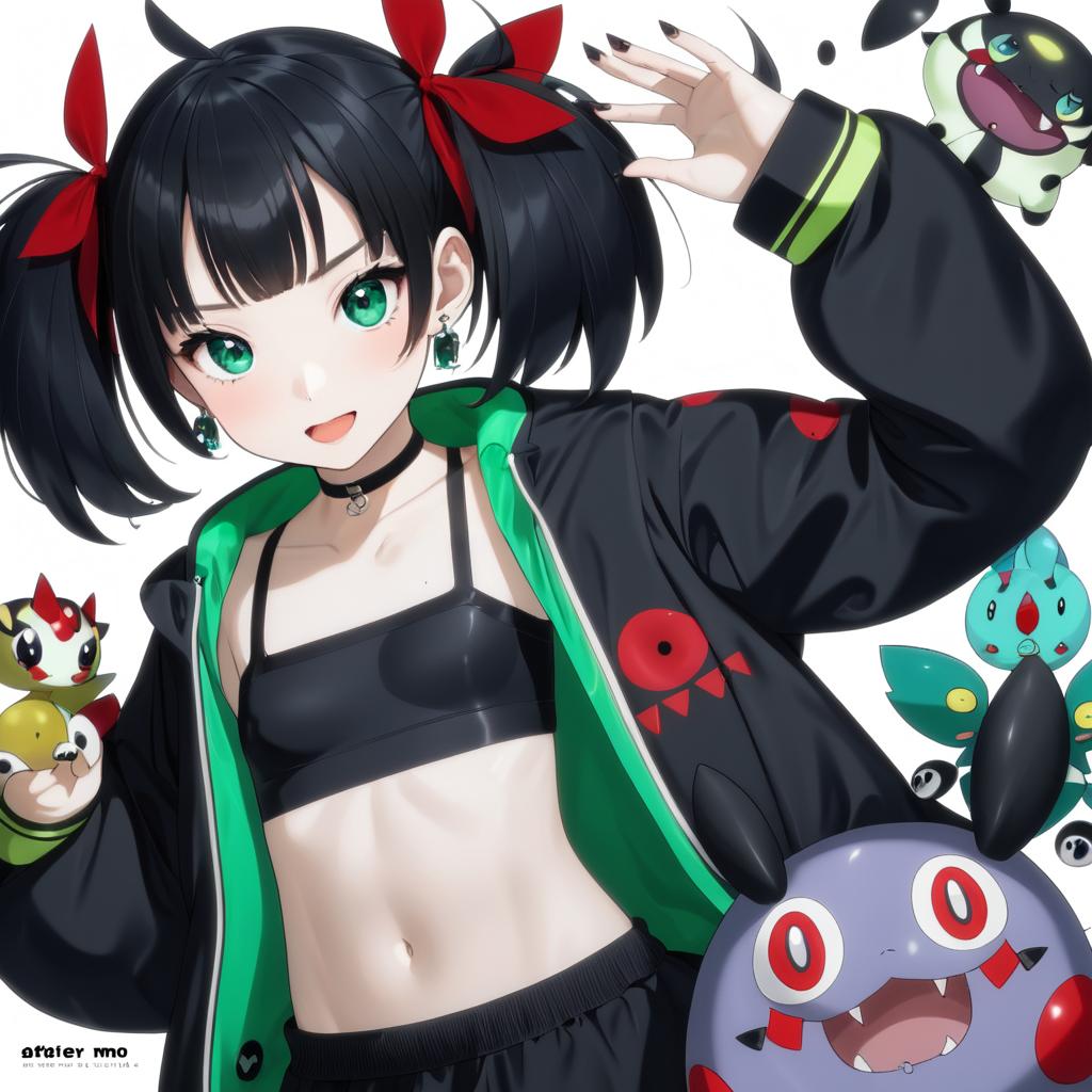 Morpeko (hangry), pokemon, 1girl, hand up, aqua eyes, green eyes, black hair, medium hair, asymmetrical bangs, short twintails, twintails, hair ribbon, small breasts, navel, collarbone, open jacket, black jacket, red ribbon, black choker, long sleeves, black nails, nail polish, earrings, pokemon (creature), stomach, by artist atelier-moo, anime