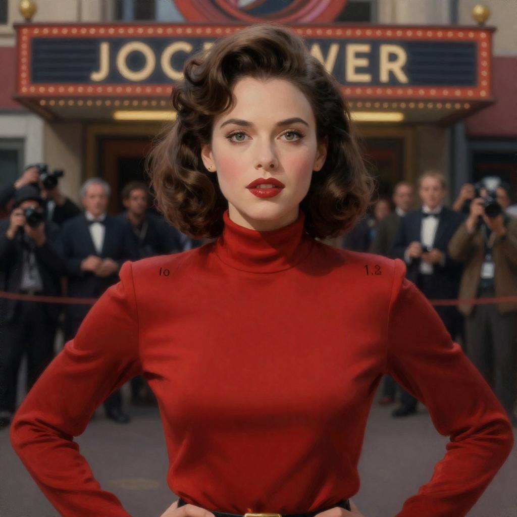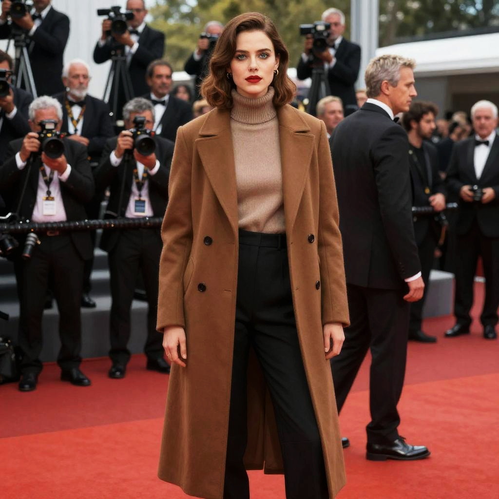 Photorealistic portrait of a stylish woman standing on a red carpet at a movie premiere. She wears a cream-colored turtleneck top and a shiny silver long skirt. In the background, photographers and paparazzi capture the event while other guests in formal attire mingle. The scene conveys glamour and sophistication typical of a film premiere setting.