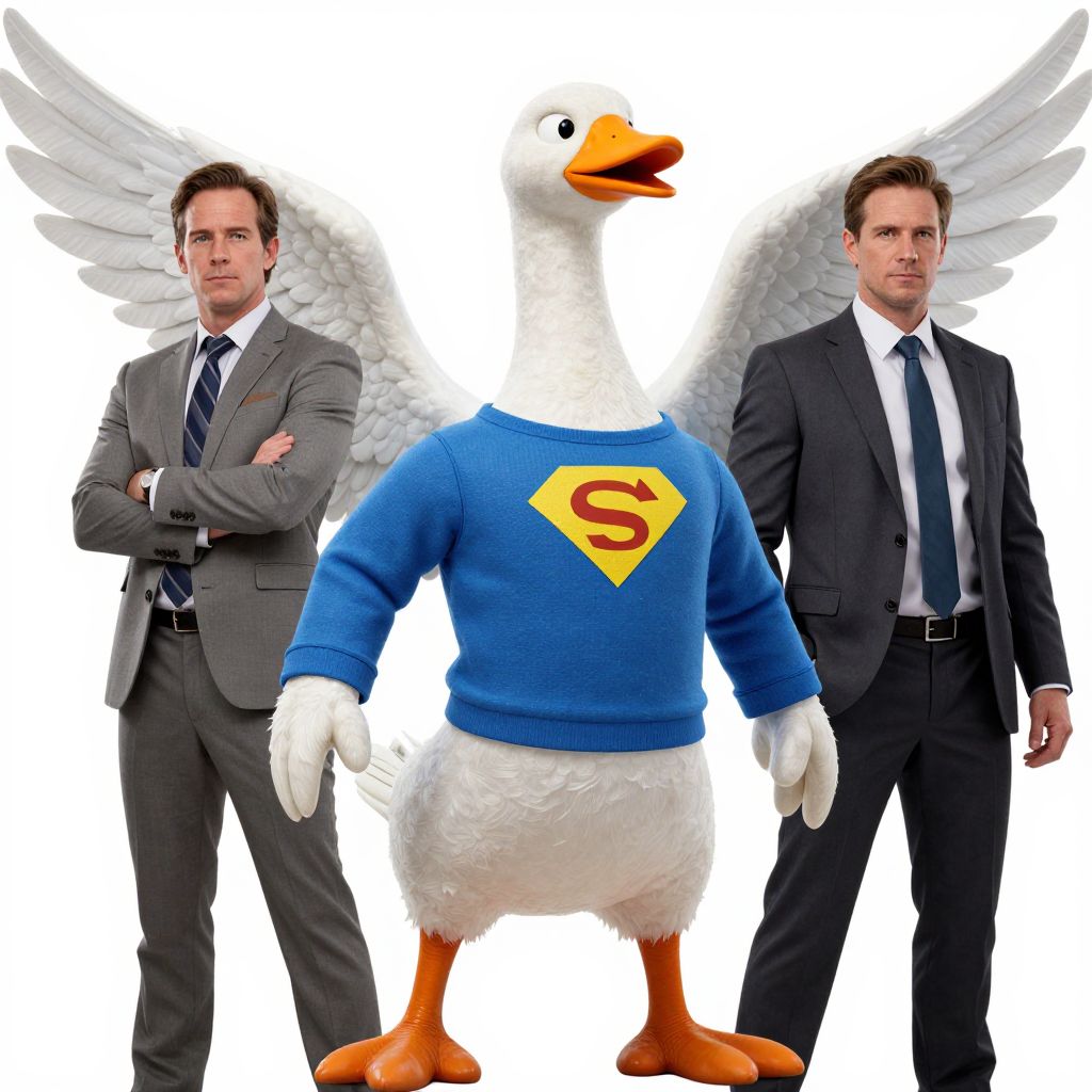 Photograph of two men in suits standing beside a white duck with yellow beak, wearing a blue Superman sweater with yellow "S". White background.