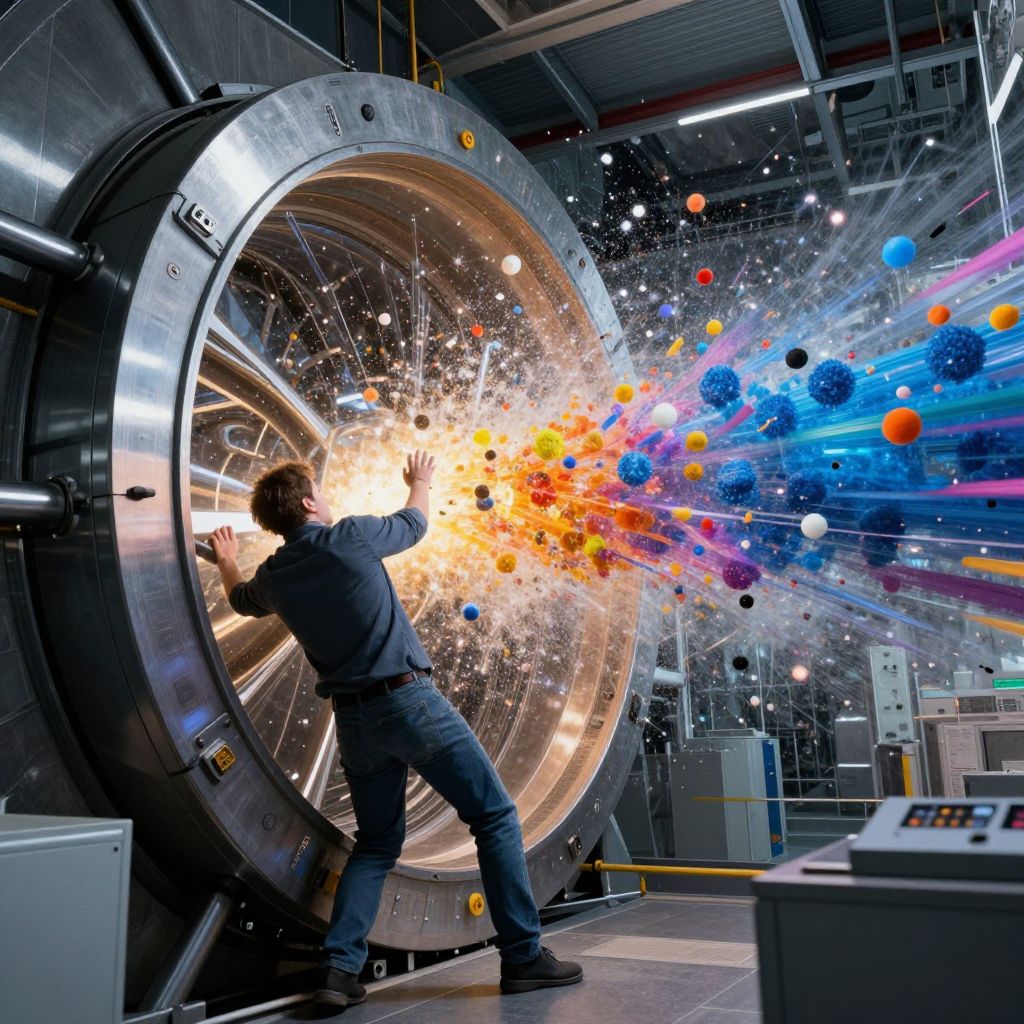 Wide shot of a man getting trapped inside cern large hadron collider, his body getting pulled apart by particle collision, rendered in octane, maximalism, ultra high detailed, colorful