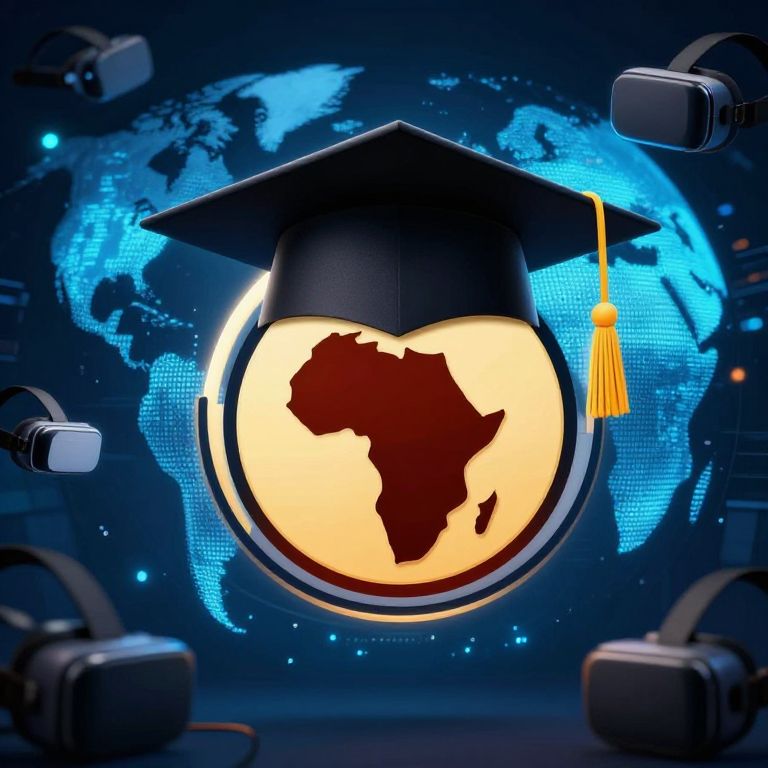 Digital illustration of a glowing, yellow Earth with a dark brown silhouette of Africa at its center, topped by a black graduation cap with a yellow tassel. The background features a blue, pixelated, 3D globe and floating, gray VR headsets on all sides. The overall style is modern and futuristic, with a focus on education and technology. The colors are predominantly blue, black, yellow, and brown, creating a vibrant and dynamic visual effect.