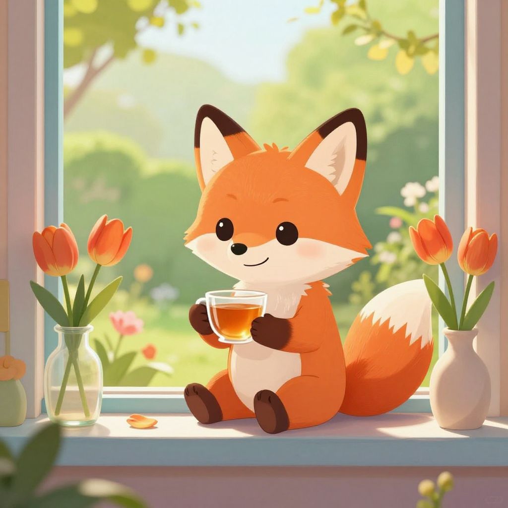 A digital illustration of a cute, chibi-style, orange fox with white underbelly and dark brown paws and ears, sitting on a sunlit windowsill. The fox holds a glass of tea with both paws, smiling with large, black, shiny eyes. Surrounding the fox are two vases of orange tulips, one in a clear glass and one in a white ceramic. The background shows a blurred, bright garden with sunlight filtering through greenery. The overall color palette is warm and vibrant, with soft, glowing light enhancing the cheerful, whimsical atmosphere.
