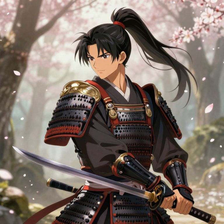 Anime male ponytail warrior in traditional samurai armor, holding a katana with cherry blossom petals swirling around, misty forest background, intricate details on armor and hair strands, soft lighting with warm tones
