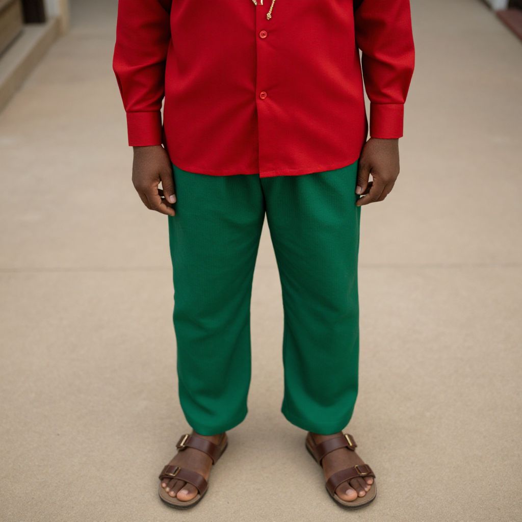 Man wearing a red shirt and green pants with a gold necklace and sandals.